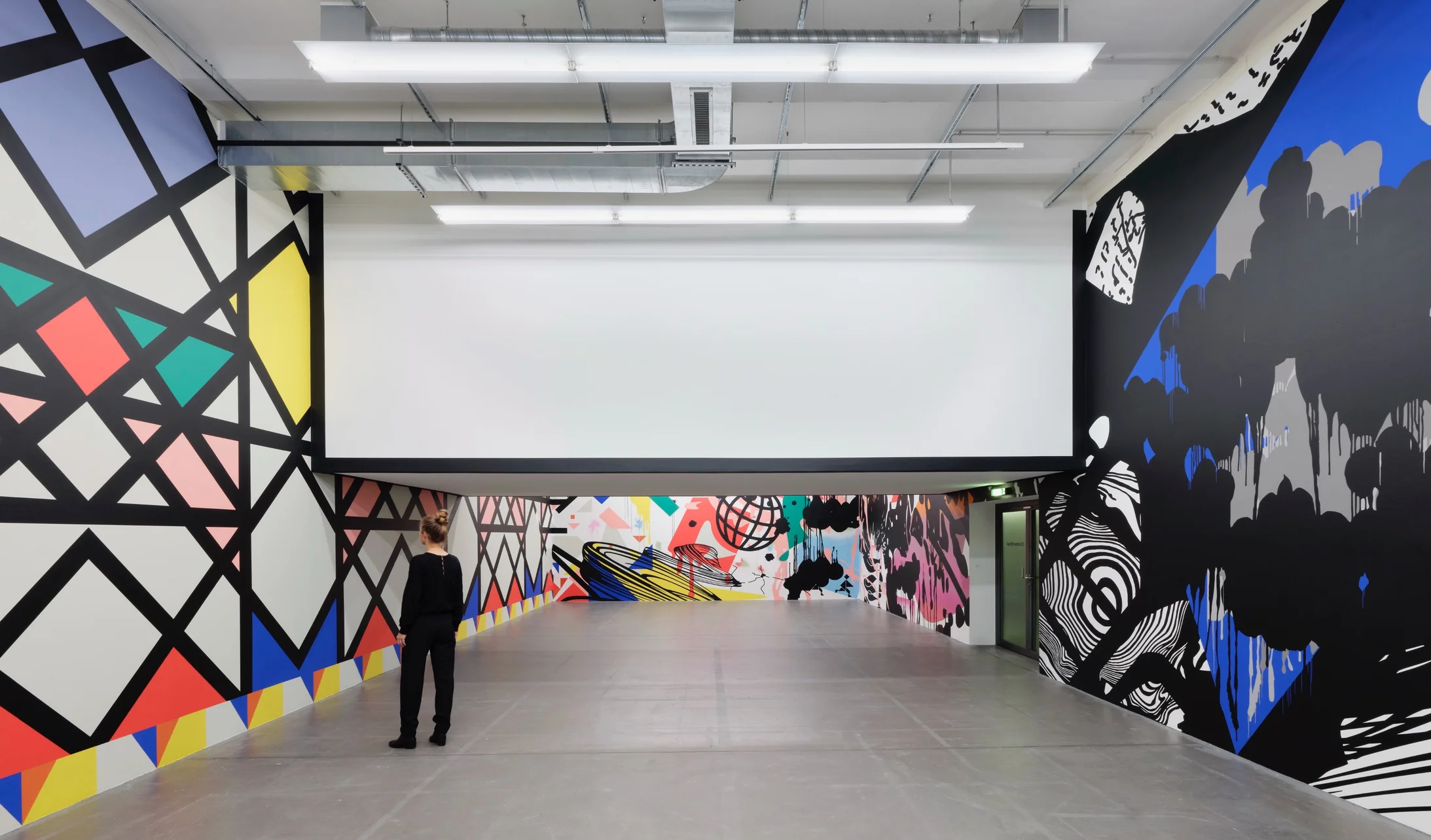 Doch nicht erst am Endpunkt der Ausstellung, im letzten Raum der obersten Etage, begegnet man einem Ausgangspunkt ihres Mottos. Auf ein erstes All-Over trifft man schon beim Eintritt ins Museum. Den Raum von Foyer, Empfang und Café, in dem noch ein wuchtiger Kranhaken als Zeuge der einstigen Gebäudenutzung von hoch oben herunterhängt, hat Claudia Comte mit dem Werk «Easy Heavy III» (2013) gestaltet. Die den Raum umgreifende Arbeit vereint Elemente von Op-Art und Pop-Art und bereitet mit heiterem Hintersinn die Eintretenden auf das vor, was sie in diesem Haus erwartet: Kunst, die gelegentlich irritiert, aber sehr oft vor allem Freude macht.