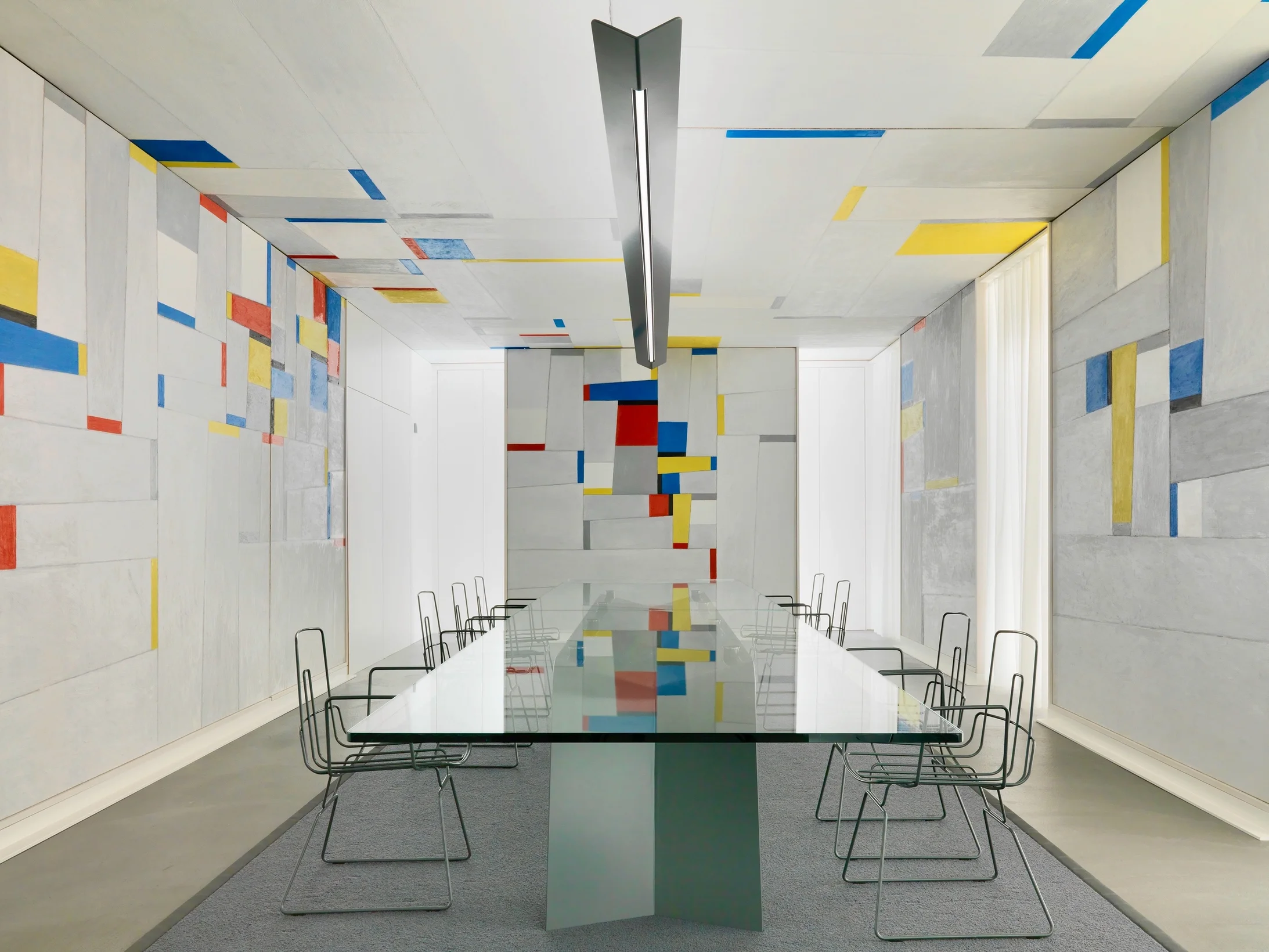 Das augenzwinkernd doppeldeutige Motto benennt sowohl die künstlerische Form des sich in alle Richtungen ausdehnenden Werks als auch das schlichte «alles vorbei». Was das Kunstkonzept des «All-Over» betrifft, so ist dieses im Haus Konstruktiv seit jeher heimisch. Der 1963/64 für die New Yorker Stadtwohnung des damaligen Gouverneurs entstandene «Rockefeller Dining Room» des Amerikaschweizers Fritz Glarner ist als permanente Installation für das Museum ein Ensemble von programmatischer Bedeutung. Mit seinem All-Over von Malerei, Möbeldesign und Innenarchitektur knüpft es an die disziplinenübergreifenden Gestaltungen von russischem Konstruktivismus, De Stijl und Bauhaus an. Nicht zuletzt antwortet der Dining Room auf bildnerische Experimente der Zürcher Konkreten, deren Erbe das Museum pflegt und weiterträgt.