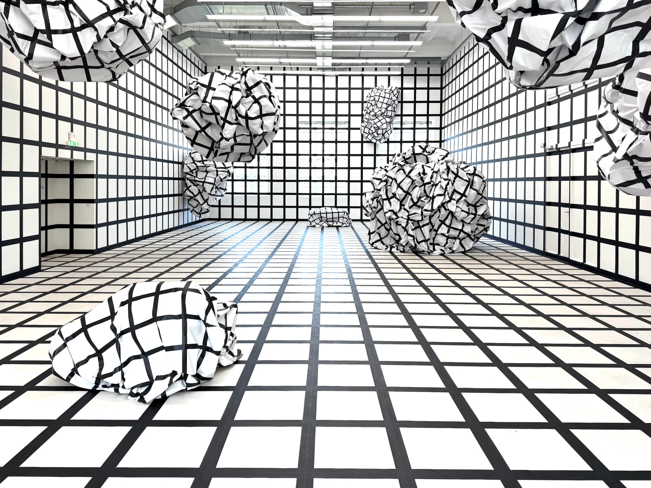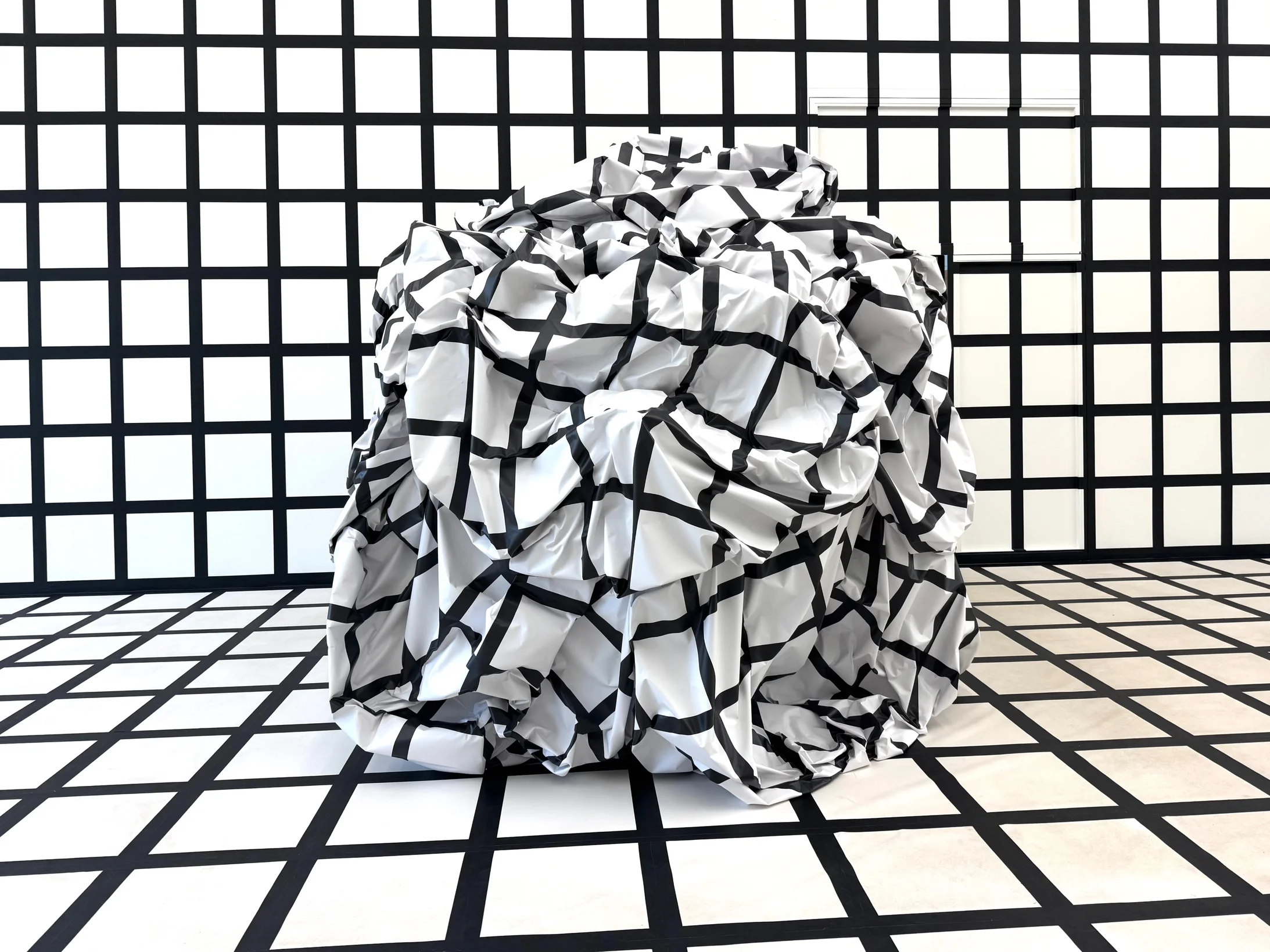 Dieses All-Over, das auch über Türen und Fenster geht, intensiviert die Raumwahrnehmung in nie gesehener Weise, indem es die bei jedem Move des Betrachters ändernden Perspektiven extrem hervorhebt. In diesem vibrierenden Raum befinden sich zehn amorphe, mit der strengen Geometrie kontrastierende Objekte, bei denen das gleiche Karo als Hülle über verborgene Gegenstände geworfen ist oder wie ein zerknülltes Papier im XXL-Format am Boden liegt, im Raum hängt oder an der Wand klebt.