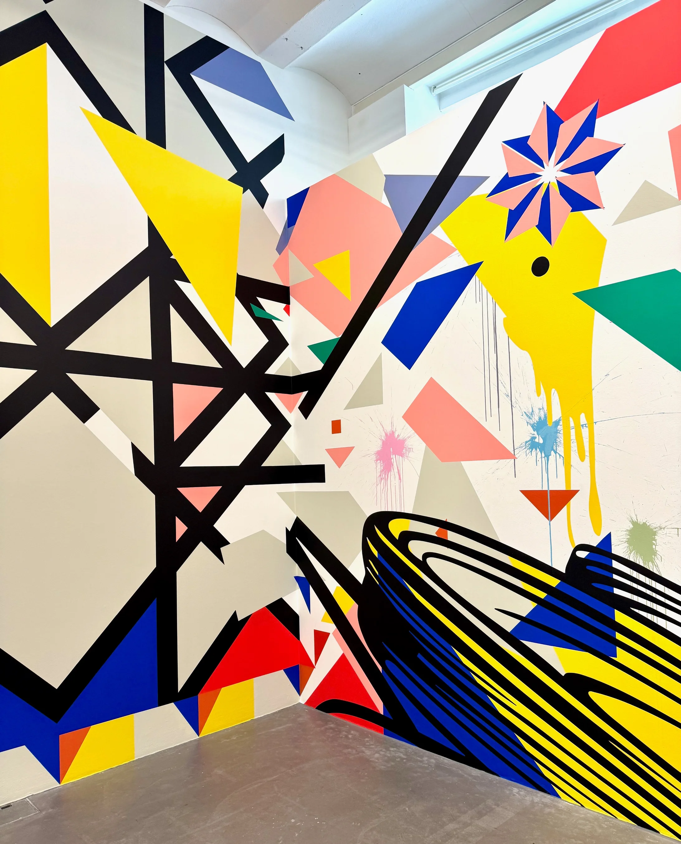 Doch Christine Streulis All-Over ist keine Thesenkunst, sondern ein Spiel zunächst mit Bills Mondrian-Version und dann mit immer weiteren Referenzen: Roy Lichtensteins Brushstrokes, Ikonografien der Street Art, Verfahren des Action Painting. So kreiert die Künstlerin ein kraftvolles Panorama verschiedener Bildsprachen und Stimmungen. Ihre Wandmalerei folgt einer Dramaturgie des Auflösens klarer Ordnungen und damit einem Hauptstrang der Kunstgeschichte der letzten hundert Jahre. Doch das Werk ist nicht nur im Grossen wahrnehmbar. Immer wieder wird der Blick zu Details gezogen, die man einzeln als konstruktiv-konkretes Bild liest. Dann wird «Who pays the Bill» unversehens zum Baukasten, aus dem das Auge des Betrachters eine unabschliessbare Reihe faszinierender Gemälde mitkreiert.
