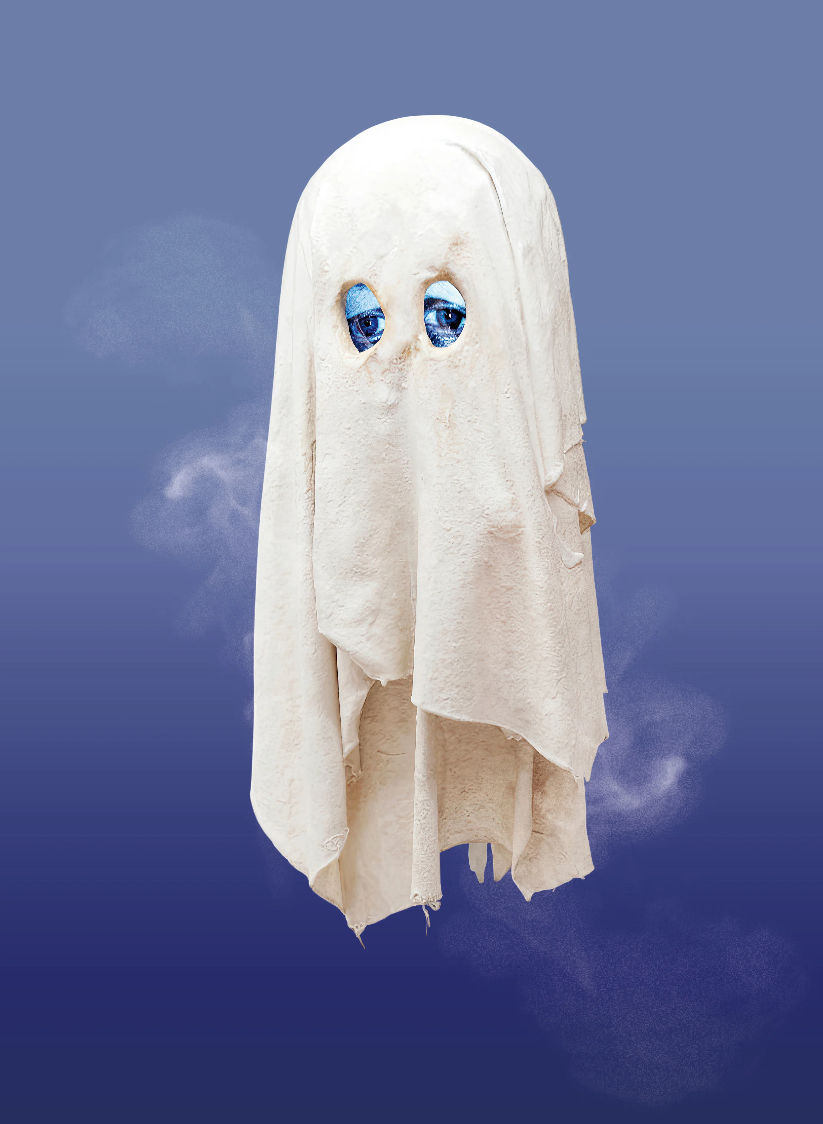 Katharina Fritschs «Geist» wird von einem weissen Leintuch verhüllt und trägt damit die eigentliche Geister-«Uniform», jenes Kleid, das wir – und nicht nur wir, sondern auch die ganze Geschichte der Bilder – traditionell mit Geistern in Verbindung bringen: Wenn wir als Kinder «Geist» spielen wollten, warfen wir ein Leintuch über und schnitten zwei Löcher für die Augen ins Tuch. Genau so verfährt Tony Oursler mit seinem «Fantasmino», einer knapp 50 cm hohen «Geist»-Puppe. Eine Video-Konstruktion gibt den Augen in den ausgeschnittenen Löchern Leben: Für die Ausstellungsmacher ein geeignetes Maskottchen für ihr Unternehmen.