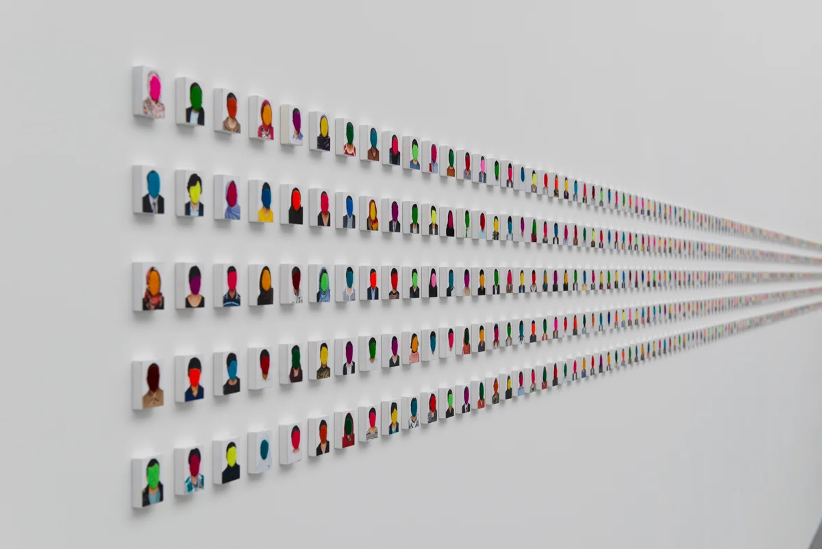 Manch eine Werkgruppe in der Ausstellung erschliesst sich für die Besuchenden erst, wenn sie um die Geschichten dahinter wissen. Ihre politische Sprengkraft wird erst so erfahrbar, denn was zu Beginn harmlos erscheint, kann durchaus politische Sprengkraft entwickeln. Das gilt etwa von der berührenden Installation der 1994 in Afghanistan geborenen, heute in Teheran lebenden Latifa Zafar Attaii. Sie gehört zur Ethnie der Hazara, die unter zahlreichen Diskriminierungen zu leiden haben. Die Künstlerin thematisiert diese hierzulande kaum wahrgenommenen Ausgrenzungen, indem sie 1000 kleinformatige Fotos von Angehörigen der Hazara so bearbeitete, dass sie die Gesichter mit buntem Besticken unkenntlich macht (Bild oben).