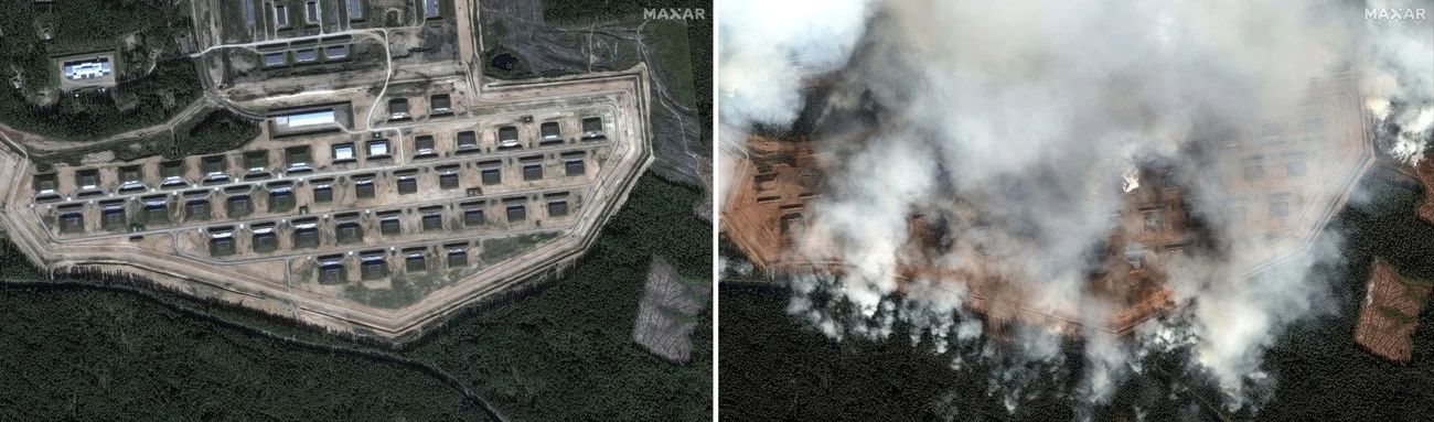 Die von Maxar Technologies am Mittwochmorgen aufgenommenen Satellitenbilder zeigten riesige Rauchschwaden, die aus mehreren Depotgebäuden aufsteigen. An Gebäuden und im nahe gelegenen Wald sind schwere Schäden sichtbar.