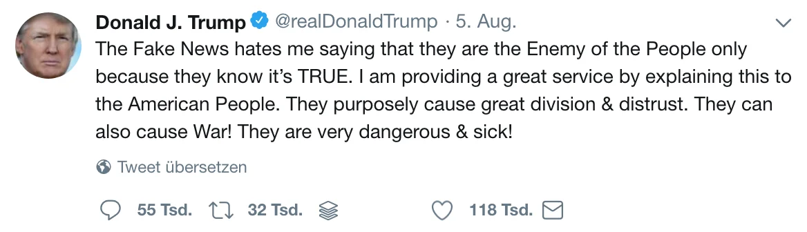 Trumps Twitter-Texte sind clever gebaut: thematisch scharf fokussiert, klare Stossrichtung, kurze Sätze, kaum Nebensätze, vorzugsweise Wörter mit nur einer Silbe (was im Englischen leichter möglich ist als im Deutschen). Am Ende steht häufig wie ein Hammerschlag ein plakativ wertendes Element: Sad! Bad! Sick! Oder auch einmal: Great!