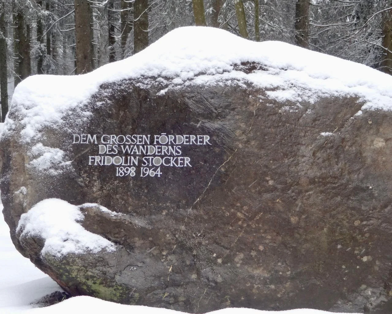 Dabei blieb sich Fridolin Stocker selbst treu: der Heimat und der Natur verbunden, wertkonservativ und mit seiner nonkonformistischen Haltung vielleicht sogar progressiv. Heute wäre er wohl ein Grüner. Rastlos war er tätig, unermüdlich unterwegs. Bis zuletzt. Stockers letzte offizielle Radiowanderung mit rund 1’000 Wanderfreunden führte ins Obwaldnerland – kurz vor seinem unerwarteten Tod. Ein Kalksteinfindling am Seeweg bei Sachseln (Foto: Carl Bossard) erinnert an den Wanderer Fridolin Stocker. Auf dem Zuger Gottschalkenberg verweist ein zweiter grosser Gedenkstein auf diesen engagierten Pädagogen und unermüdlichen Förderer des Wanderns.