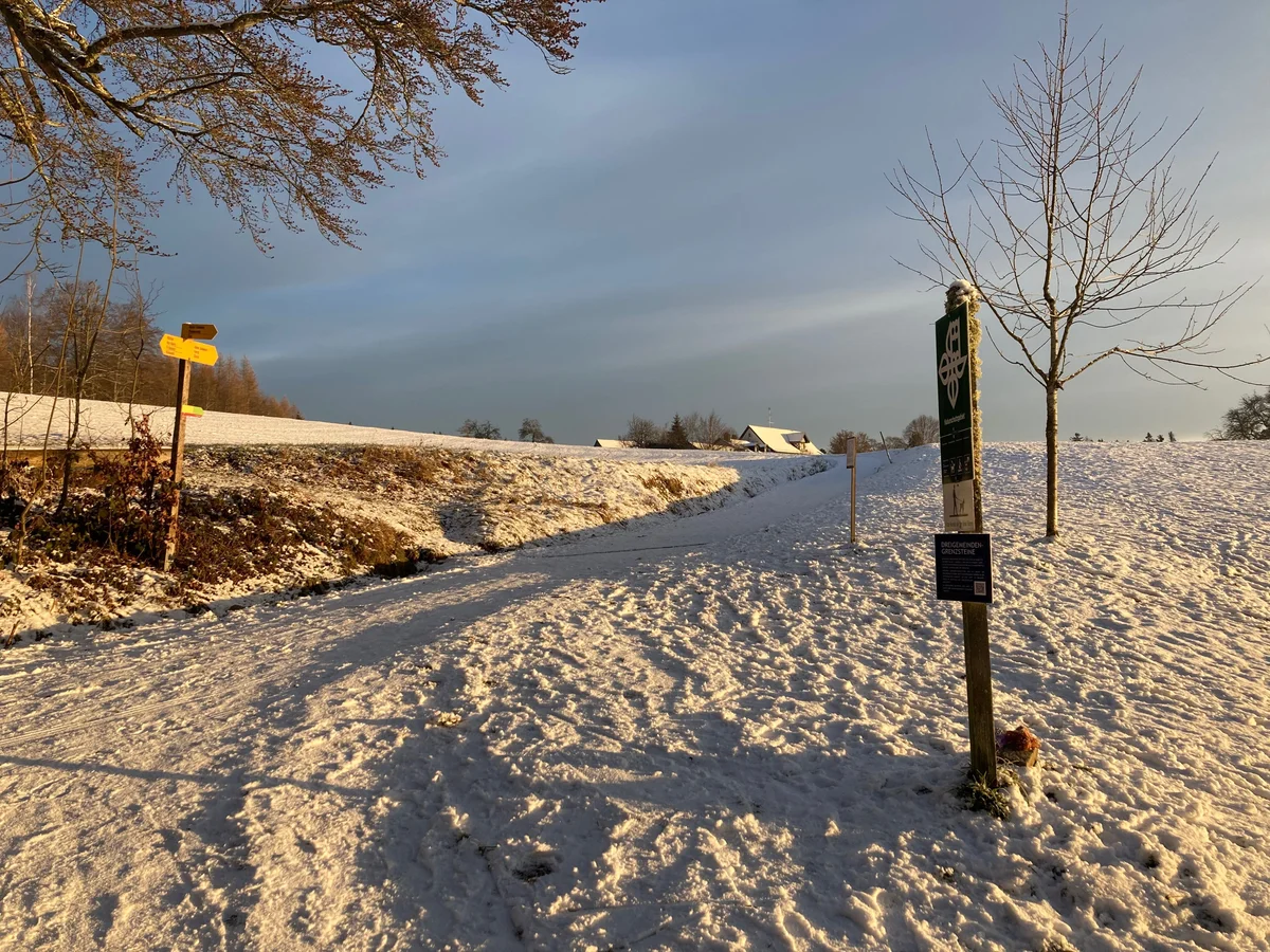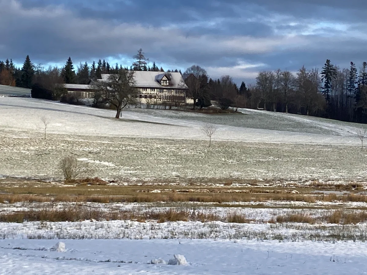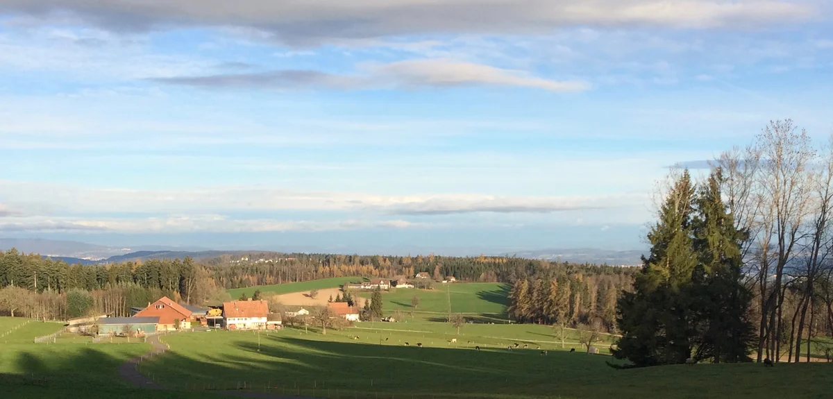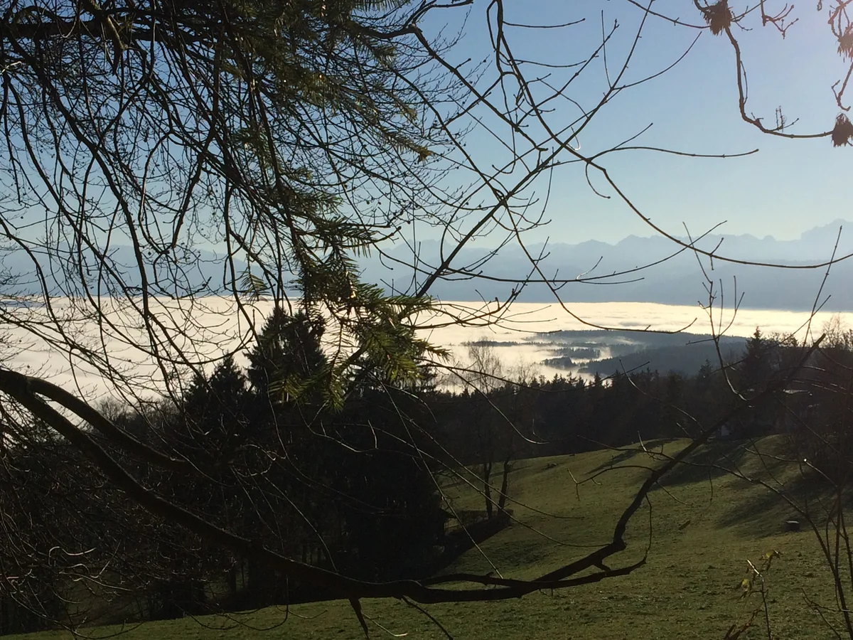 Stellen wir uns also vor: Nebel liegt über dem Zürichsee und dem Glatttal. Im Bahnhof Meilen wartet der 922er Bus; er fährt uns in einer knappen Viertelstunde hinauf an die Sonne zum Vorderen Pfannenstiel. Am Restaurant Hochwacht und dem Aussichtsturm vorbei (er stand einst auf dem Bachtel) wandern wir dem bewaldeten Bergrücken entlang Richtung Norden zur Guldener Höchi. Ein Strässchen schlängelt sich durch die Wiesen hinunter zum Weiler Vorder Guldenen. Vor einem Haus steht der in die Jahre gekommene Landrover, mit dessen Besitzer ich vor ein paar Jahren ins Gespräch über die Welt und ihre Menschen gekommen war, als er mit seinem Fahrzeug Holzscheiter zur Feuerstelle beim Aussichtsturm auf der Hochwacht transportiert hatte. Ja, die Städter, meinte er: Manchmal könnte man ob ihrer fehlenden Einsicht in das reale Leben auf dem Land und ihrer Egomanie («Jemand wird hier dann schon aufräumen …») verzweifeln, aber er habe sich vorgenommen, darüber nicht bitter zu werden. Und bitter war er tatsächlich nicht, dafür weiser als mancher «Gstudierter».