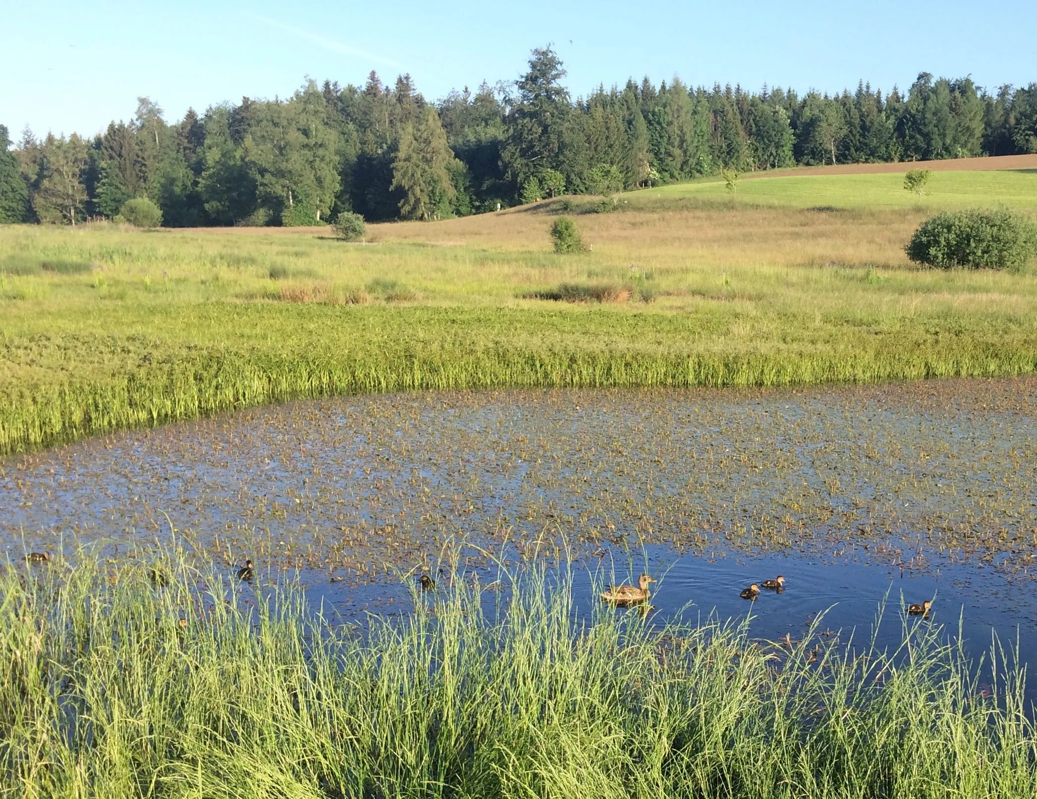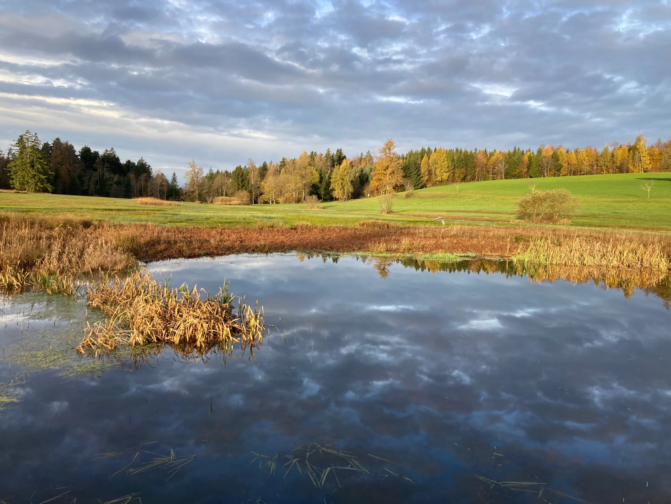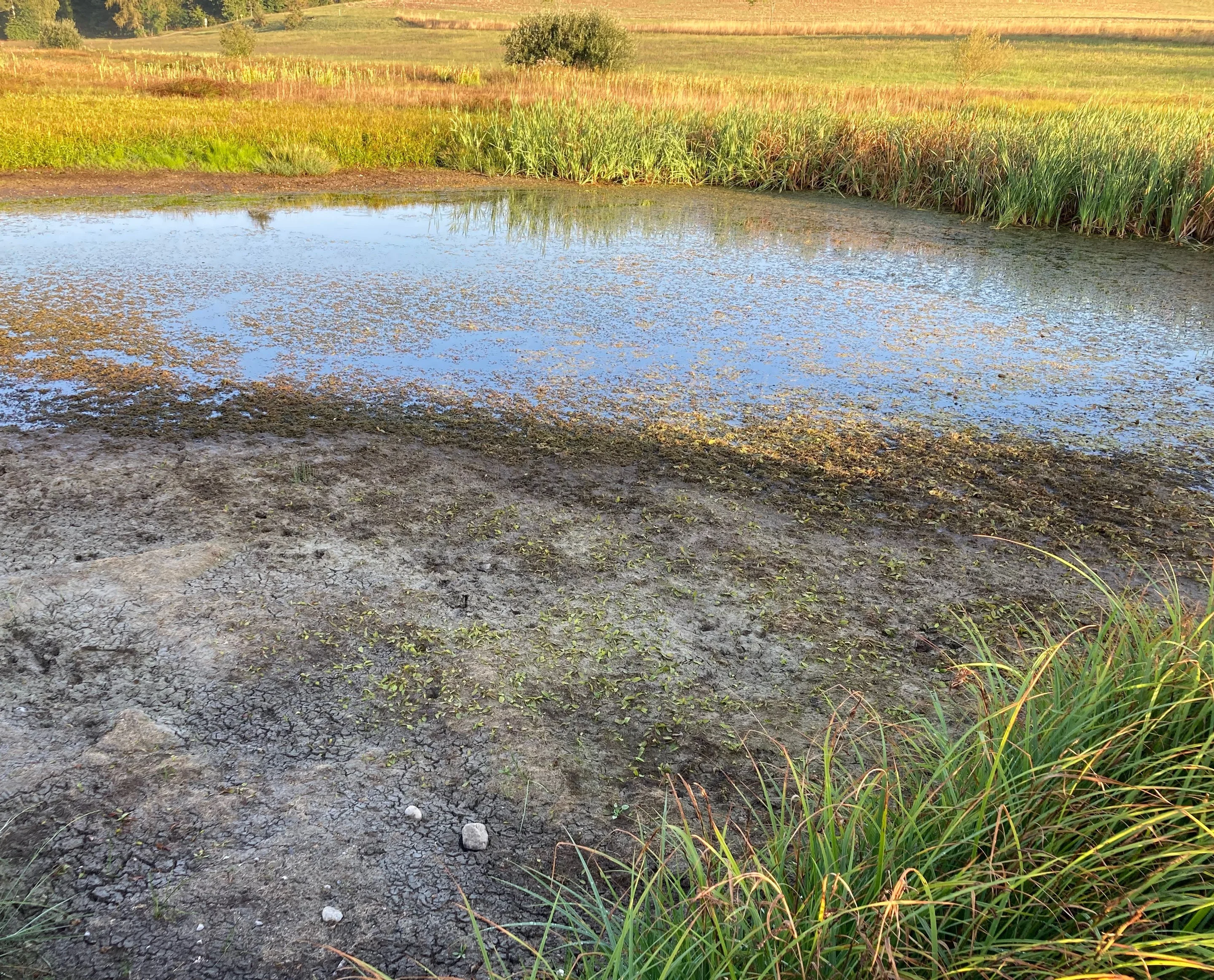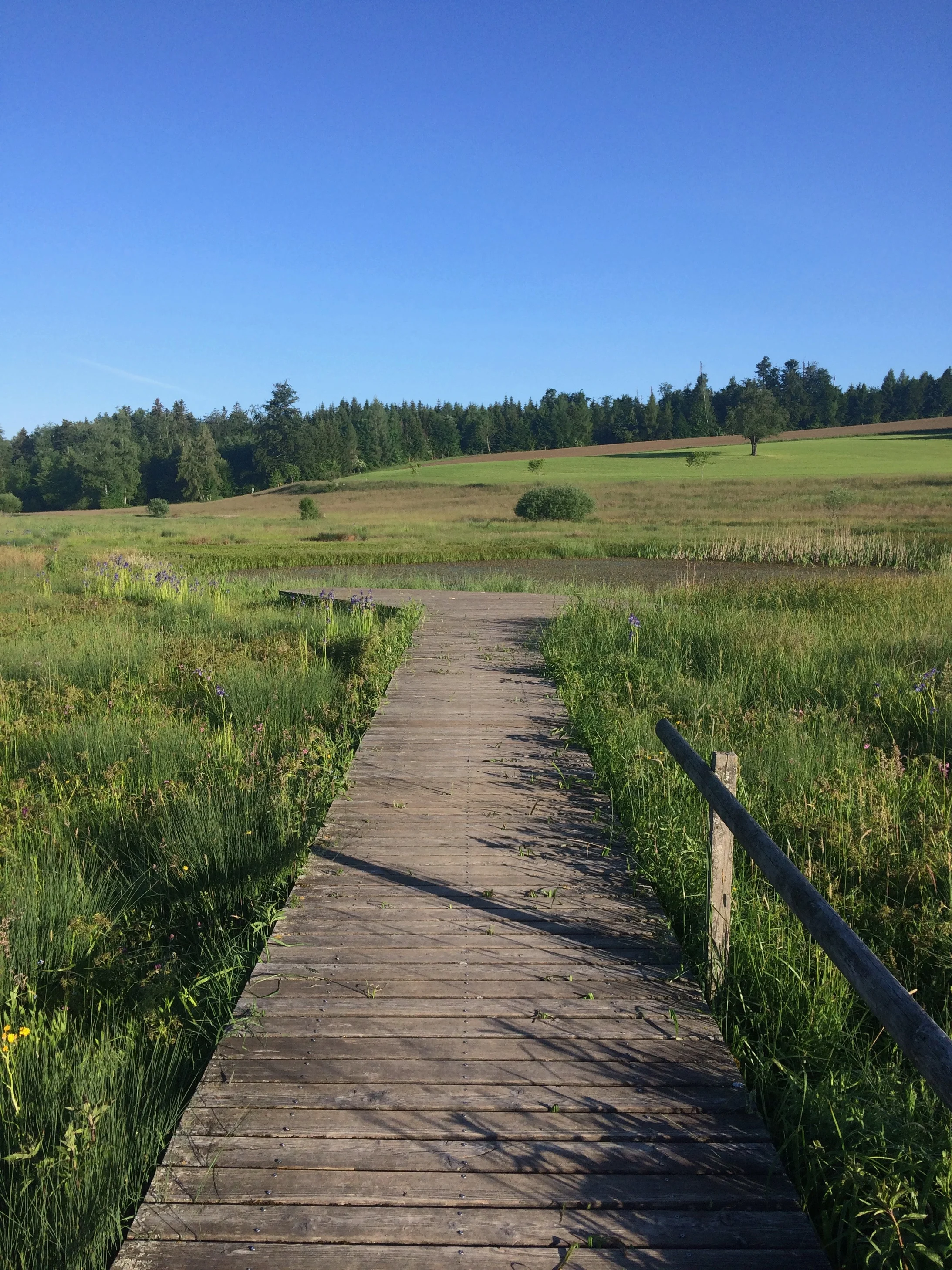 Soviel zur Spucke-Hydrologie. Ich gehe dem Waldrand entlang nordwärts und nehme im Sattelgrund den Weg nach Westen, der hier die Gemeindegrenze zwischen Egg und Maur bildet. Rechterhand liegt das renaturierte Feuchtgebiet, das über drei offene Wasserflächen verfügt, welche im Laufe des Sommers teilweise oder vollständig austrocknen. Allerdings soll nicht verschwiegen werden, dass der Mensch hier ein bisschen Ökomanipulator spielt und den Wasserspiegel der Teiche künstlich reguliert. Das teilweise oder vollständige Austrocknen dieser Teiche sei gewollt, habe ich gelesen, denn nur so könne verhindert werden, dass sich in den Teichen eine Fischpopulation etabliere, welche den Laich der Amphibien fressen würde. in diesem Fall könnten Kröten und Frösche hier nicht überleben.