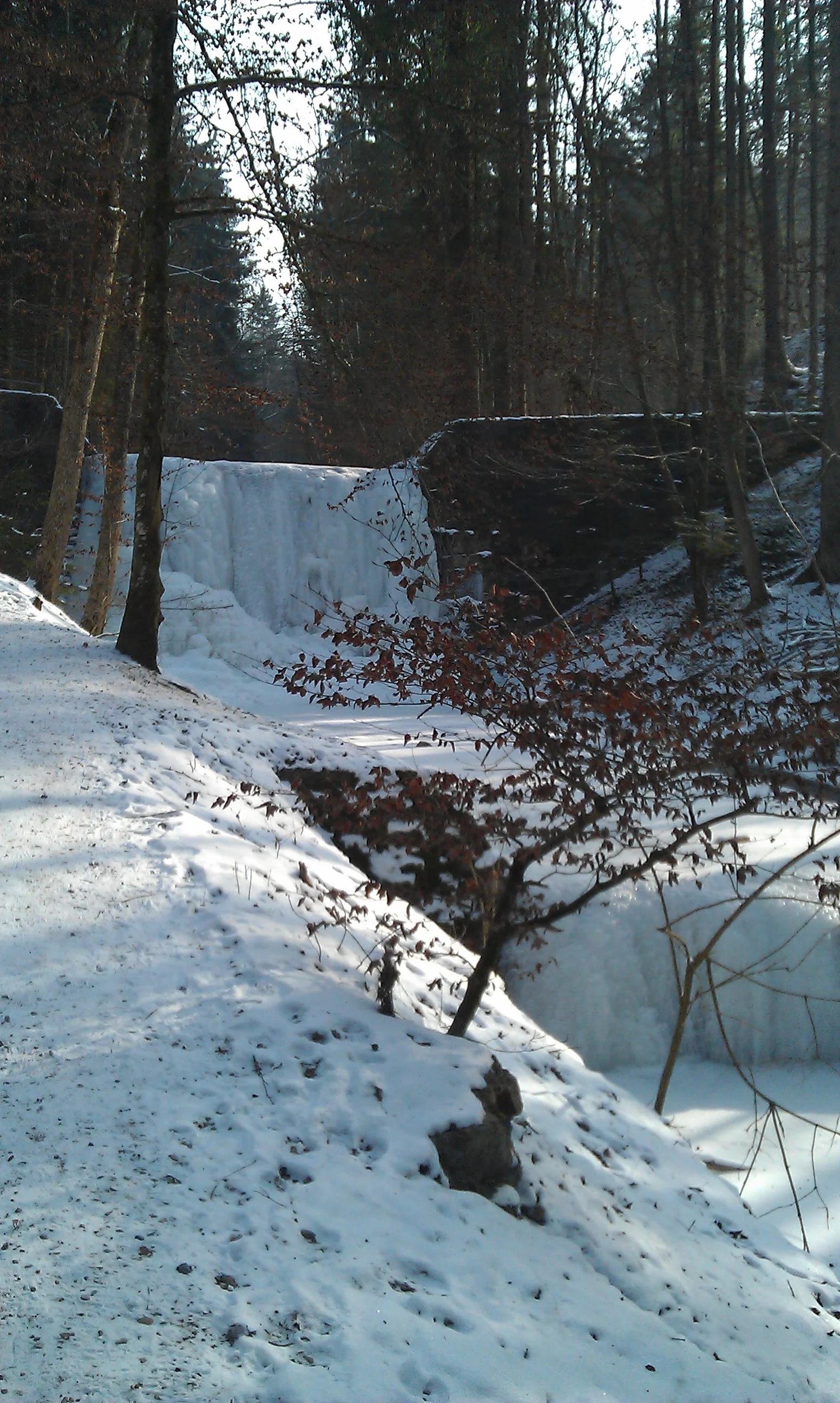 An der Hohrüti vorbei wandere ich ins winterliche Küsnachter Tobel. In meinem «Erinnerungsjahr» darf sich der Winter wieder einmal von der besten Seite zeigen. Sogar der Wasserfall unterhalb der Tobelmüli ist gefroren.