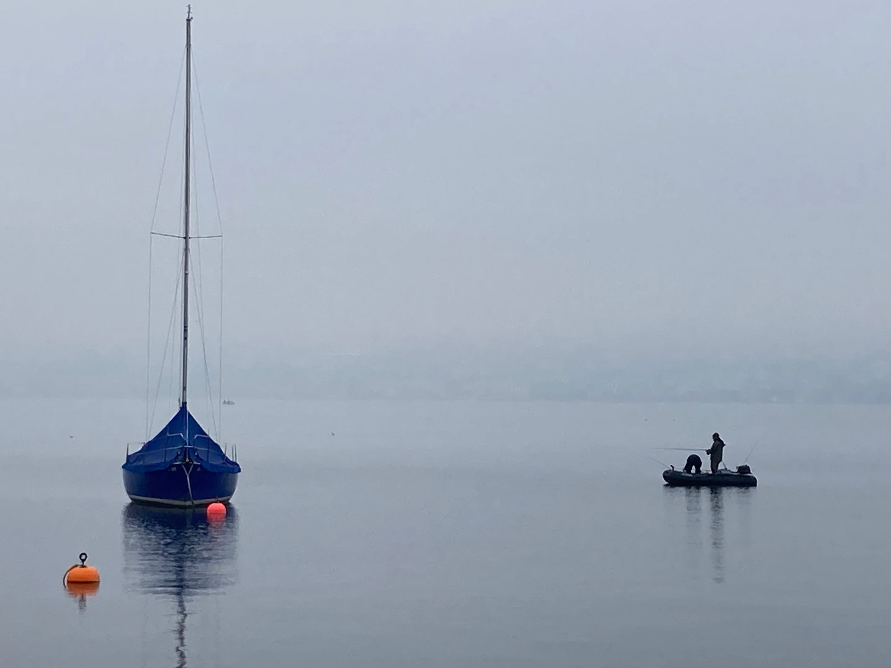 Als ich aufs weite Wasser schaue, kommt mir der kleine Guldener Teich mit seinen Enten und Fröschen in den Sinn. Ob wohl meine Spucke hier angekommen und dann ihren Weg zur Limmat und Aare gefunden hätte? Wie anders ist doch der Zürichsee als jener Teich. Es ist still auf dem Wasser (wir befinden uns im Winter), die Bojen schwimmen einsam wie schlafende Wasservögel. Nur an einer liegt ein Segelboot mit blauer Blache, daneben ein Gummiboot mit zwei Fischern. Das andere Ufer verschwindet im Nebel. Man muss nur die Augen zukneifen, dann ist man am Meer (dem Endpunkt aller Spucke) und gleichzeitig ganz nahe am kleinen Teich auf Guldenen.