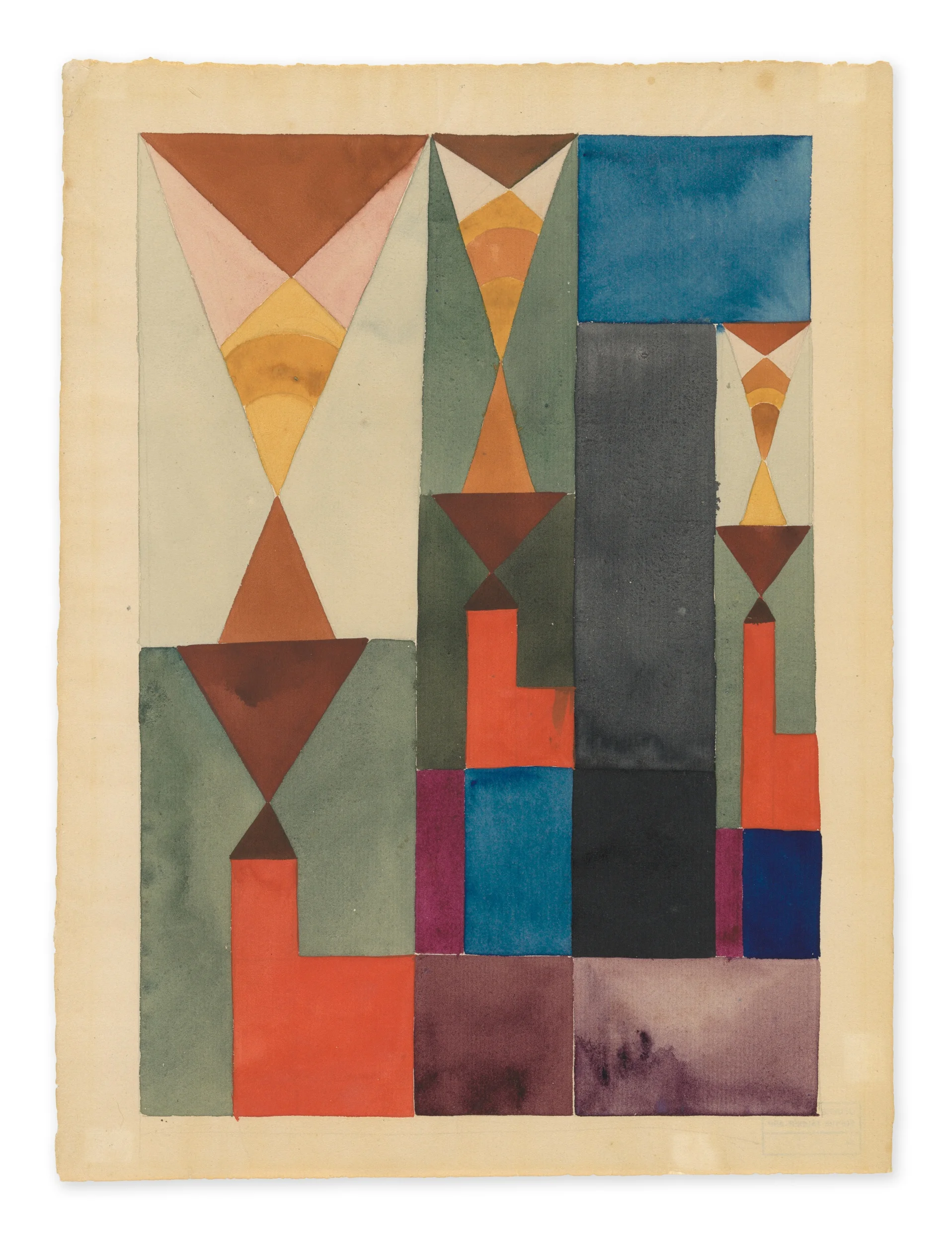Sophie Taeuber-Arp: Vertikal-horizontale Komposition mit gegenseitigen Dreiecken, 1918, Wasserfarbe auf Papier, 31.1 x 23.4 cm; Kunstmuseum Basel – Stiftung Arp e.V., Berlin; Foto: © Alex Delfanne