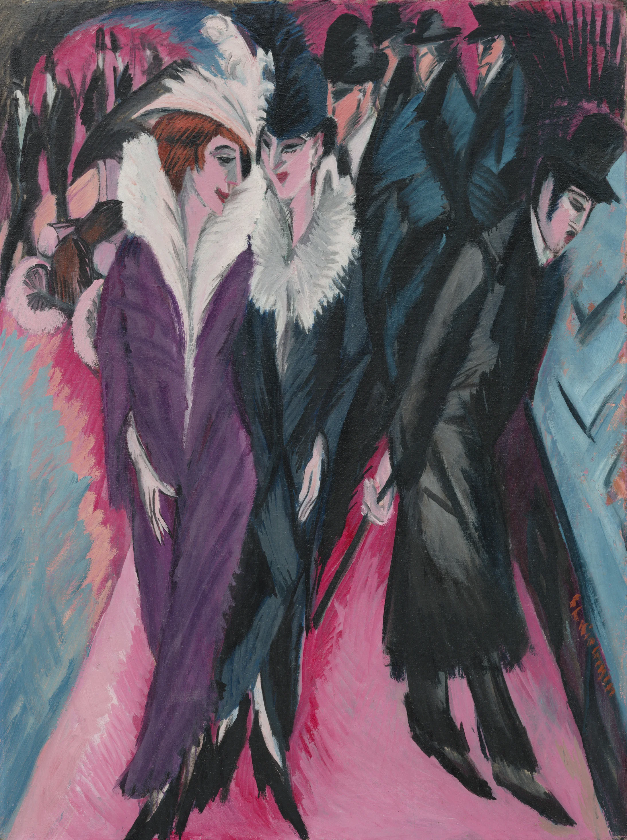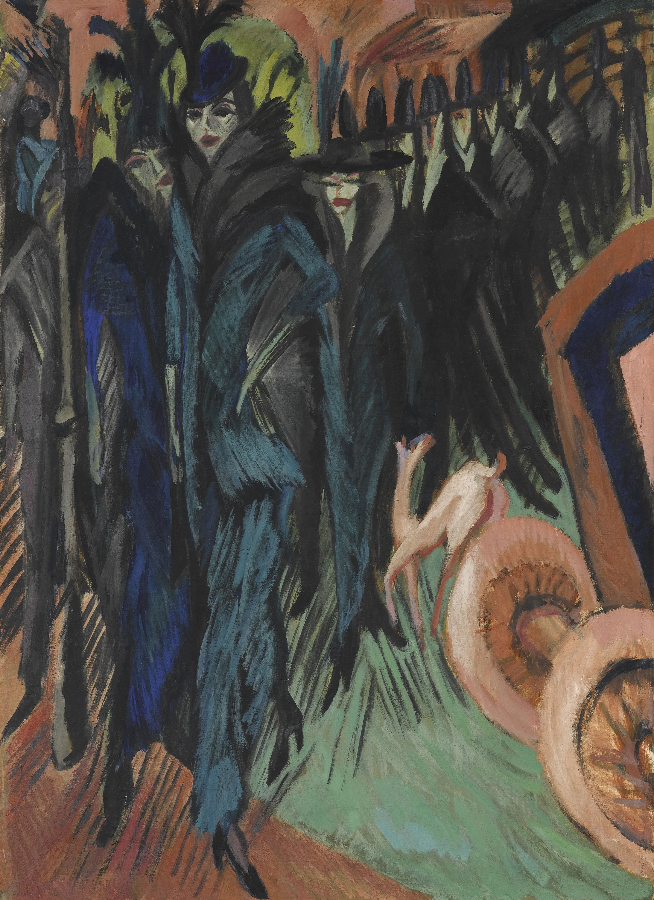 Und erst die berühmten Strassenbilder mit flanierenden Frauen! Feiern die Fehmarn-Sujets eine ursprüngliche Weiblichkeit, so zelebrieren die Strassenszenen mondäne Frauenbilder. Dass die höchst elegant gekleideten Damen in Wirklichkeit Kokotten sind, denen das Stehen auf der Strasse polizeilich verboten ist, gibt der Szenerie einen doppelten Boden. Kirchner führt Glamour und Abgründigkeit dieser Situationen mit kraftvoller Pranke vor Augen.