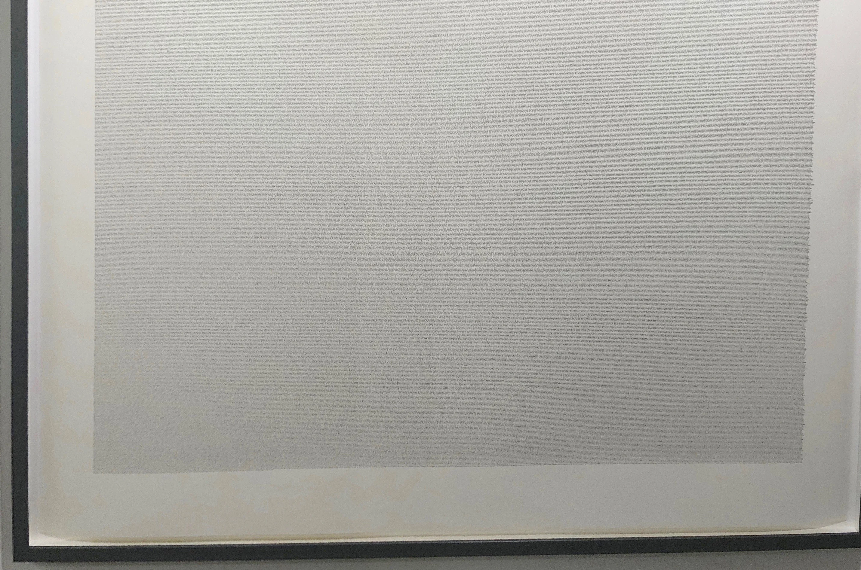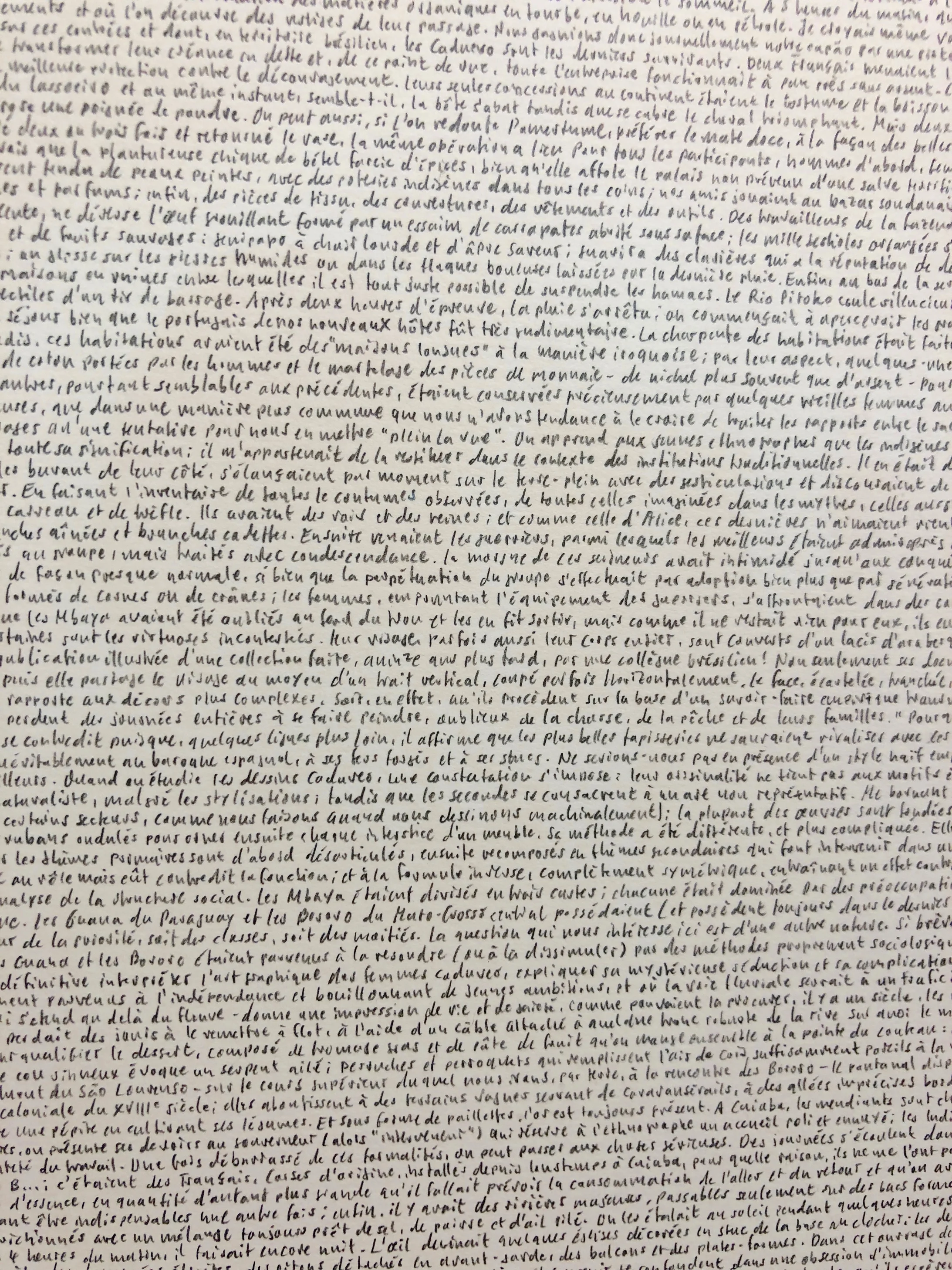 Goldbach hat früher schon Kants „Kritik der reinen Vernunft“ als Mikrogramm-Bild gestaltet. Seine Textwahl entspringt der Hochschätzung epochaler Werke, denen er sich als bildender Künstler mit der grösstmöglichen Hingabe und Disziplin widmet. Die über 400 Seiten der „Tristes tropiques“ erscheinen in akkurater Bleistiftschrift auf dem knapp zwei Meter hohen und anderthalb Meter breiten Blatt und erzeugen einen vibrierenden und dabei völlig homogenen Textblock. Ein solches Werk erfordert nicht nur eine lange geübte Schreibhand, sondern auch bei jedem Arbeitsgang eine stets neue Einstimmung von Geist und Körper – ein mönchisches Exerzitium sondergleichen.