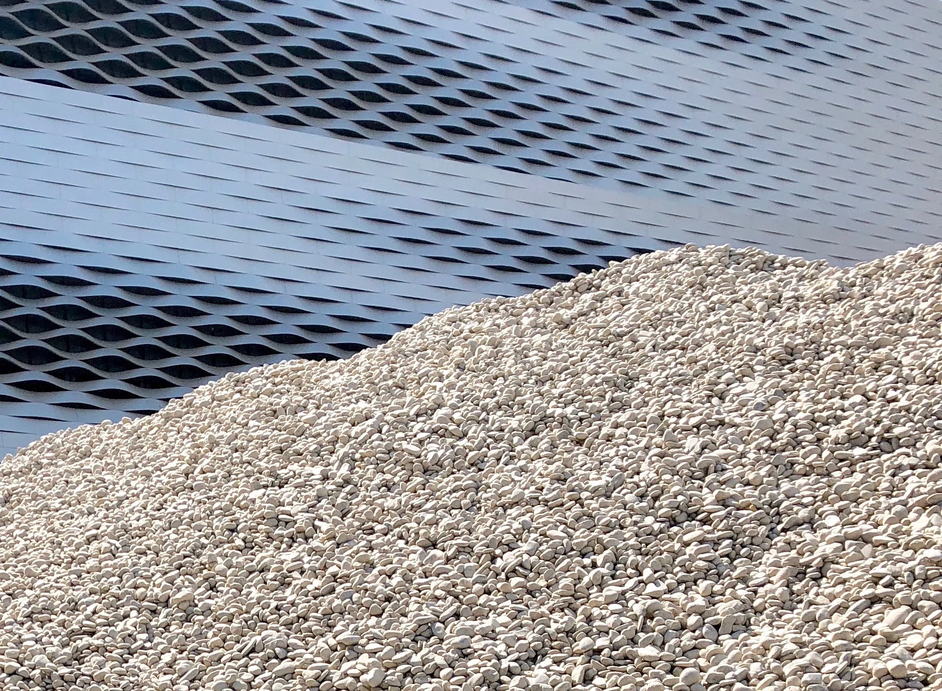 Ein paar solche Hinweise, und schon setzt der Kieshaufen Assoziationen und Gedankenflüge frei. Was wir in die Höhe bauen, müssen wir zuerst in die Tiefe graben. Und was so zutage gefördert wird für unseren Betonhunger, liegt zurzeit in Gestalt von Milliarden sauberer runder Kiesel auf dem Messeplatz. Geht man nah heran, bieten sie einen wunderschönen Anblick. Jeder einzelne Stein ist ein Naturprodukt, ein Unikat; alle zusammen bilden eine für sich genommen amorphe Masse, die jedoch durch die maschinelle Aufschüttung ihre kegelartige Form erhalten hat.