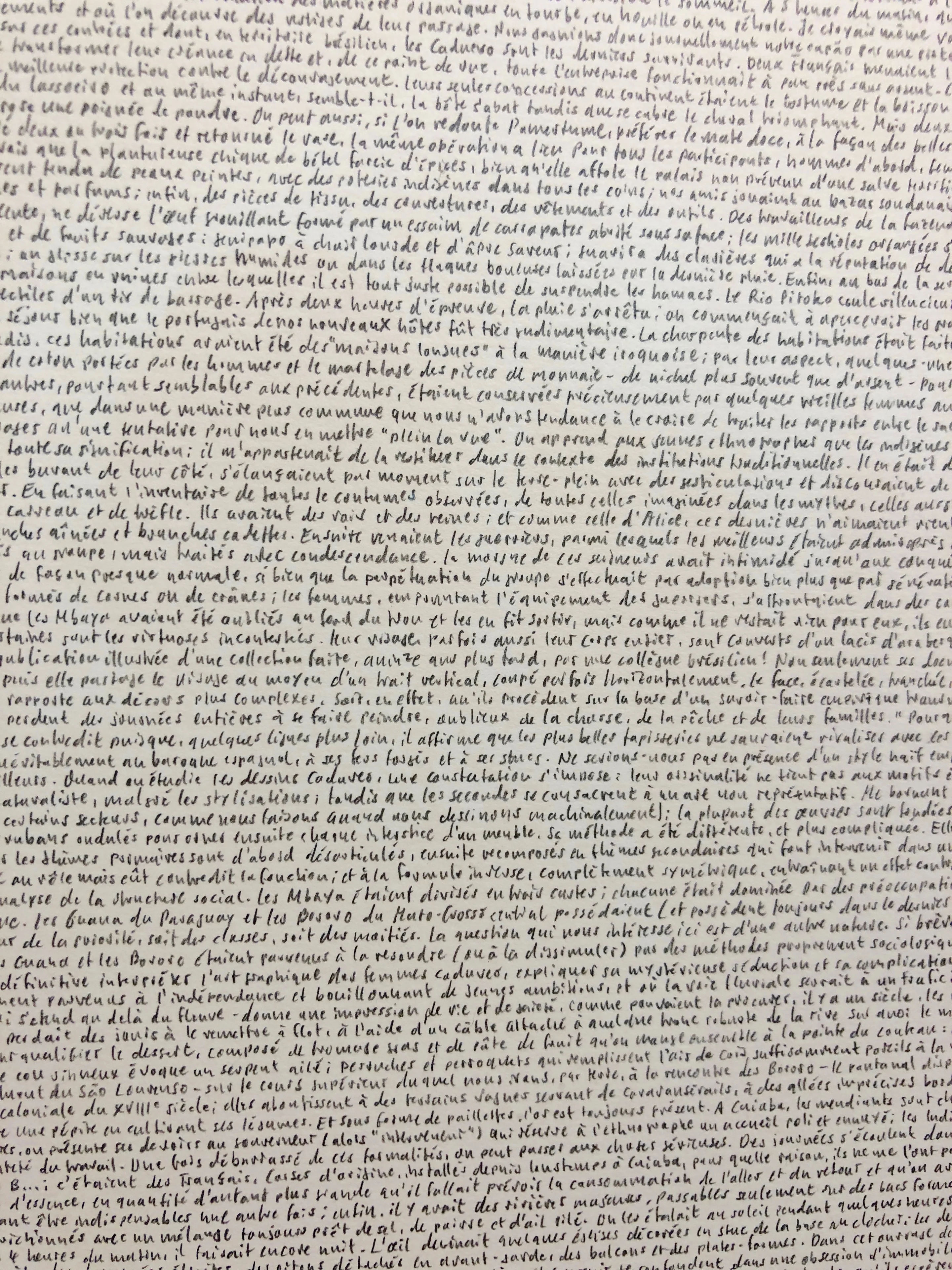 Im Unterschied zu Walser hat Goldbach sein Mikrogramm-Bild in regelmässig-schöner und perfekt leserlicher Schrift gestaltet. Man muss allerdings nahe herangehen, damit aus dem Linienmuster lesbarer Text wird. Bei diesem handelt es sich – der Bildtitel sagt es schon – um die vollständigen „Tristes tropiques“ von Claude Lévi-Strauss. Die „Traurigen Tropen“ entstanden als ethnologischer Bericht über Forschungsreisen, die Lévi-Strauss als Gastprofessor der neugegründeten Universität von São Paulo 1935–1938 in den Mato Grosso und ins Amazonasgebiet unternahm; für die Publikation stellte er den Bericht jedoch erst 1955 zusammen.