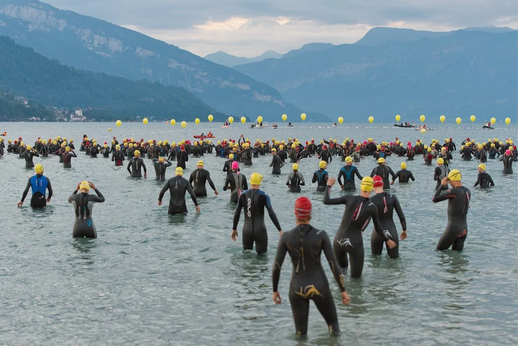 Teilnehmerinnen und Teilnehmer beim Start des 16. Inferno-Triathlons heute Samstag um 6.30 Uhr im Strandbad Thun. Der Inferno-Triathlon besteht aus 3,1 Kilometer Schwimmen, 97 Kilometer Radrennen, 30 Kilometer Mountainbiken und 25 Kilometer Berglaufen. Er führt von Thun auf das 2970 Meter hohe Schilthorn. (Foto: Keystone/Lukas Lehmann)