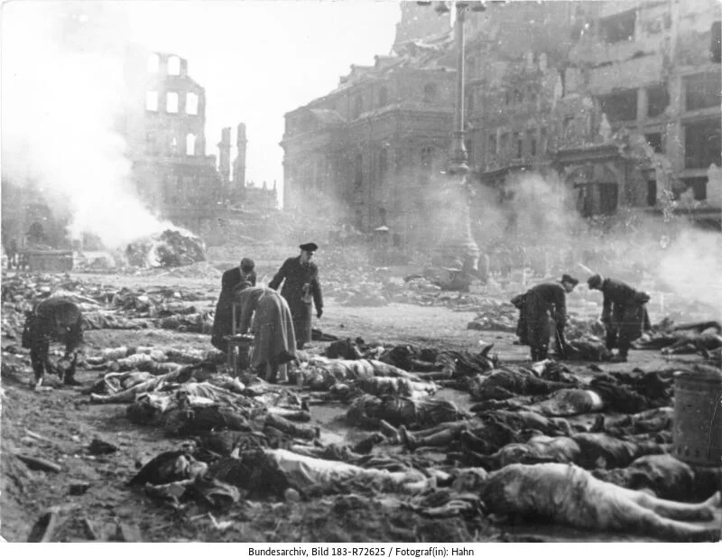 Nach den Angriffen werden die Leichen eingesammelt und auf öffentlichen Plätzen gestapelt. Dort werden sie verbrannt, um Seuchen vorzubeugen. Allein auf dem Altmarkt werden 7‘000 Leichen angezündet. Andere Todesopfer werden auf dem Heidefriedhof und dem Johannisfriedhof beigesetzt. Viele verkohlte Leichen liegen noch tagelang in den Strassen oder in den Trümmern.
