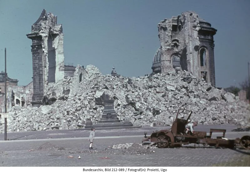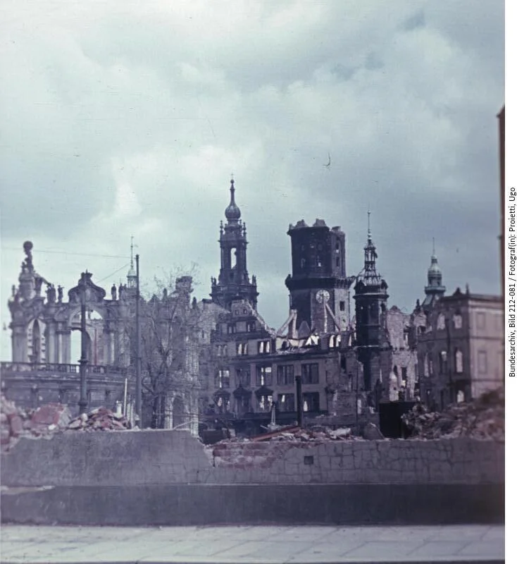 Dreiviertel der Dresdener Altstadt brennen. Ganze Strassenzüge liegen in Ruinen. Fast alle Häuser in der Innenstadt sind zerstört oder schwer beschädigt. Luftschutzräume stürzen ein. Die Semperoper, die Frauenkirche und das Residenzschloss sind zerstört. Die Brücken im Stadtzentrum sind unpassierbar. Die Kultur- und Kunststadt Dresden, das „Florenz an der Elbe“, gibt es nicht mehr.