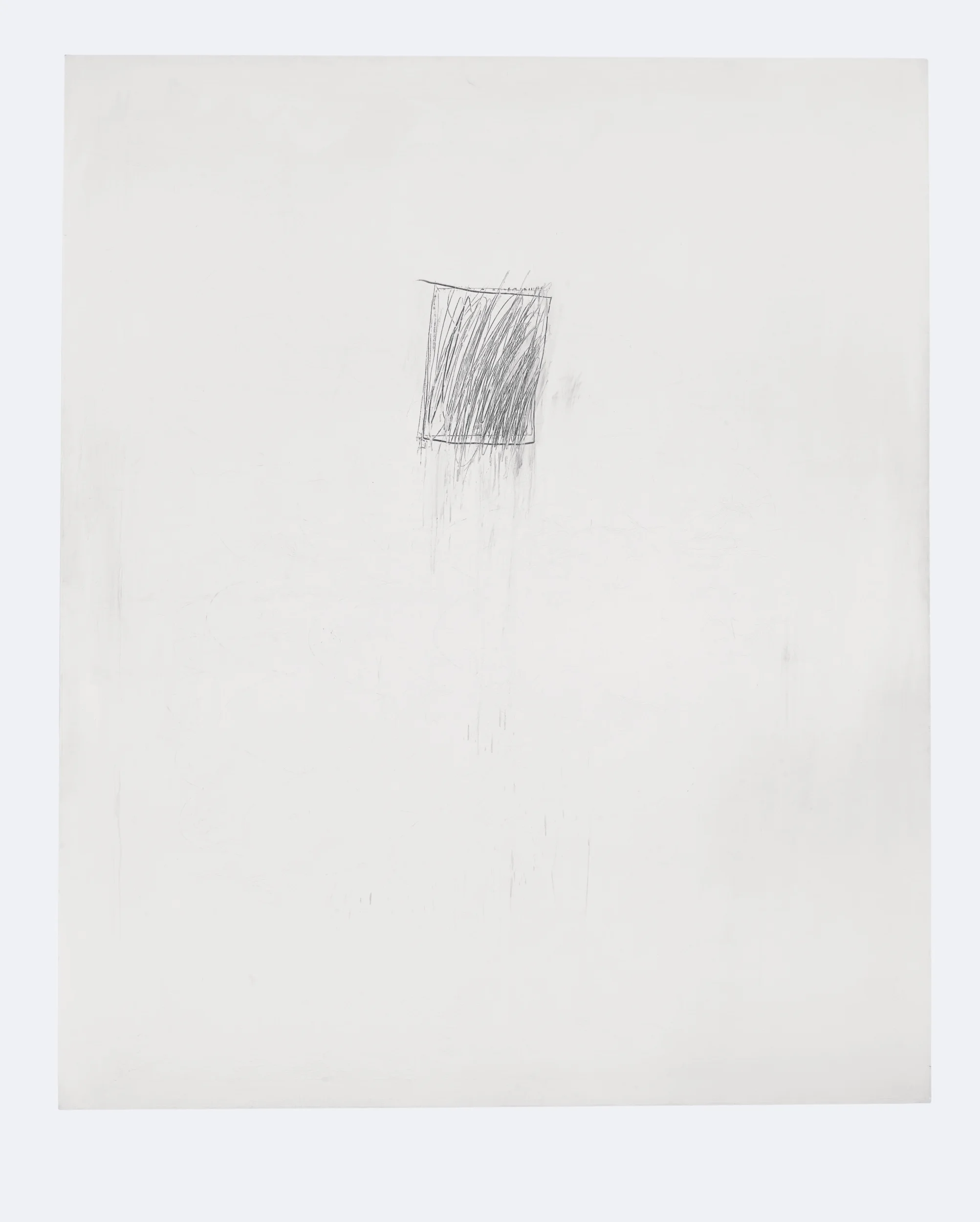 Elf Jahre nach «Arcadia» hält Cy Twombly sich bei einem Freund am Lago die Bolsena nördlich von Rom auf. Aus jener ertragreichen Schaffensperiode sticht das hochformatige weisse Bild heraus, dessen mit Bleistiftstrichen schraffiertes kleines «Fenster» die einzige ins Auge springende Form ist. Plaziert ist sie auf der fast leeren Fläche in der Vertikalen deutlich über und in der Horizontalen kaum wahrnehmbar neben der Mitte.