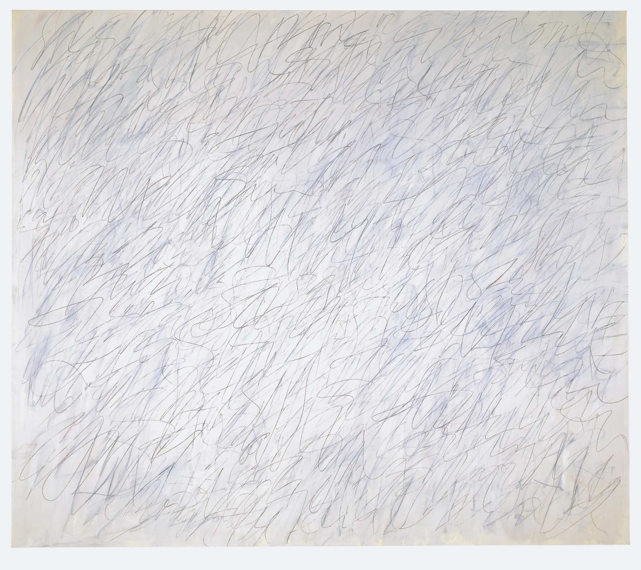 Twombly benützt jetzt neben Wand- und Ölfarben stets Bleistift und Kreide, was eine ganz andere Arbeitsweise erlaubt. Einen Pinsel muss der Maler immer wieder absetzen; mit Kreide und Bleistift braucht er den Duktus nicht zu unterbrechen. Diese Möglichkeiten nutzend, mischt Twombly fortan das Malerische mit dem Zeichnerischen und der Schrift. Zudem ist die Arbeit an den grossen Leinwänden ein «körperliches» Malen, in dem sich Bewegungen und Blickrichtungen abbilden.