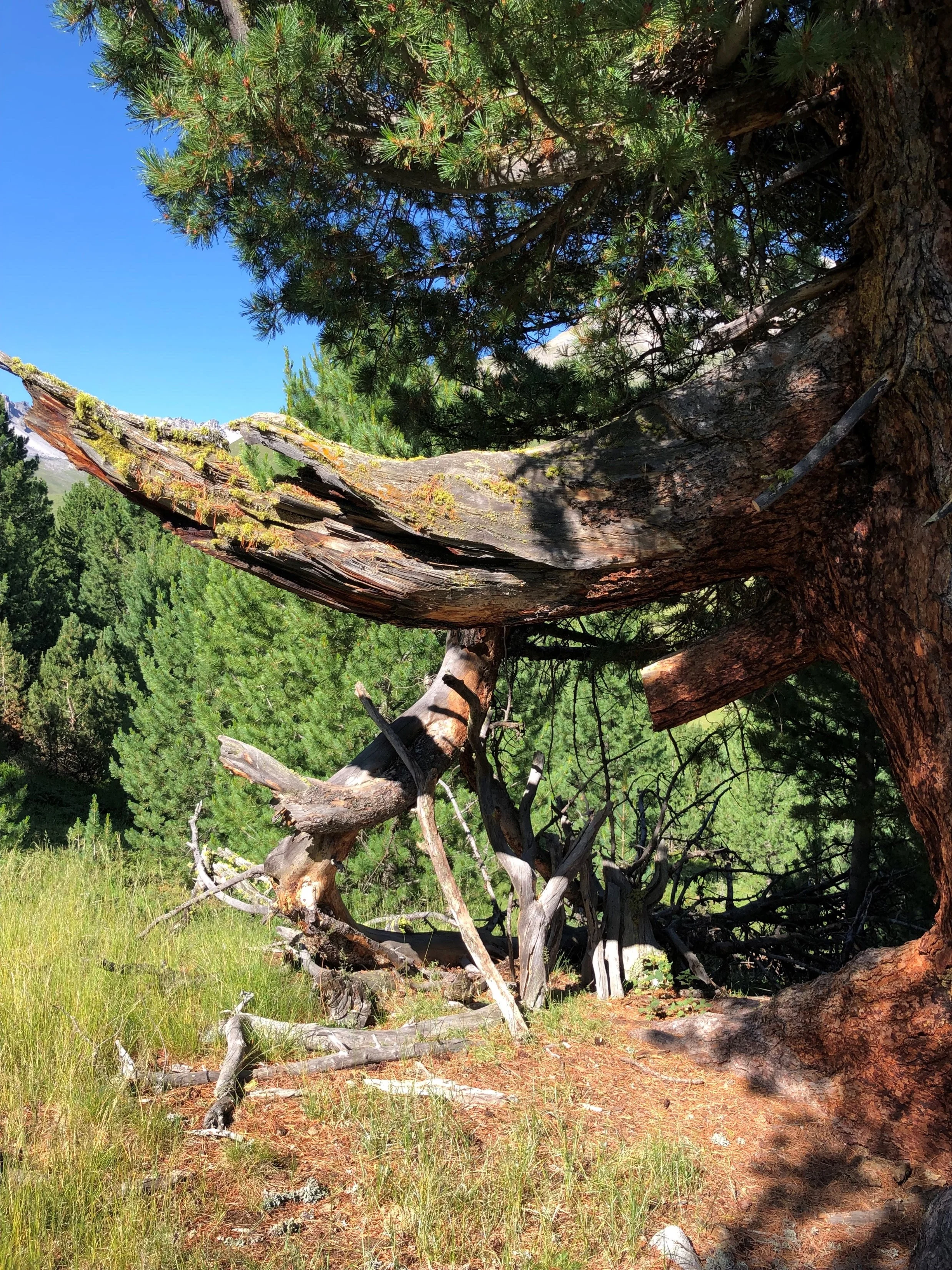 Und tatsächlich wirkt dieser Wald wie aus der Zeit gefallen. Kein geordneter Forst, keine geraden Linien. Die Arven stehen schief, geduckt, gezeichnet. Wind, Schnee und Blitz haben sie zerzaust. Äste wurden abgeschlagen, Stämme sind gekrümmt – und doch wächst alles weiter. Überleben heisst Verwandlung.