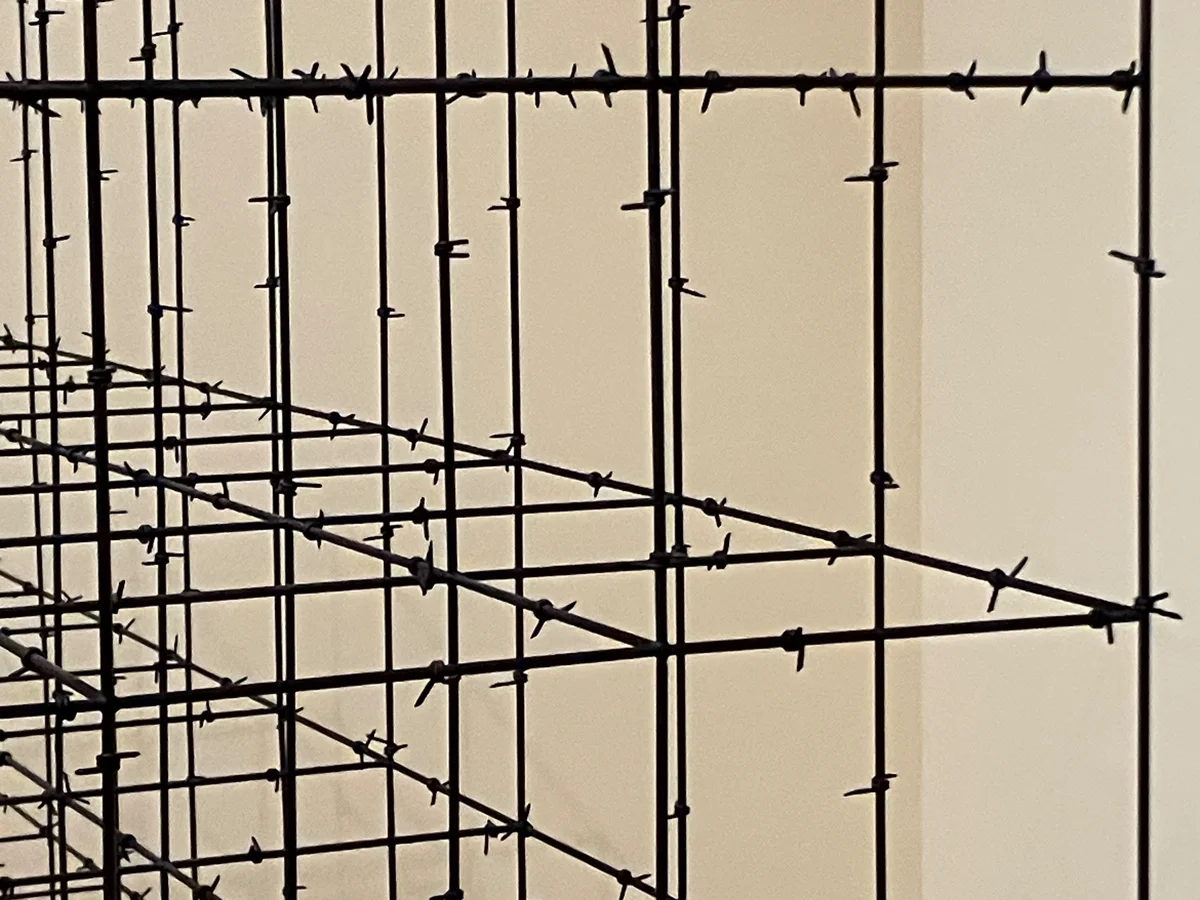 Um extreme Gefährdung geht es in «Cube 9x9x9». Mit dem Titel nimmt Mona Hatoum Bezug auf Sol LeWitts gleichnamige Skulptur aus den 1970er-Jahren, ein streng gerastertes Gitterwerk aus 729 in ihrer Grösse identischen Würfeln. Sol LeWitts Rasterelemente sind glatte und schneeweisse Balken – Minimal Art pur –, Mona Hatoum verwendet hingegen feinen Stacheldraht. Der wirkt aggressiv, doch gleichzeitig, weil filigran und poetisch, ambivalent.