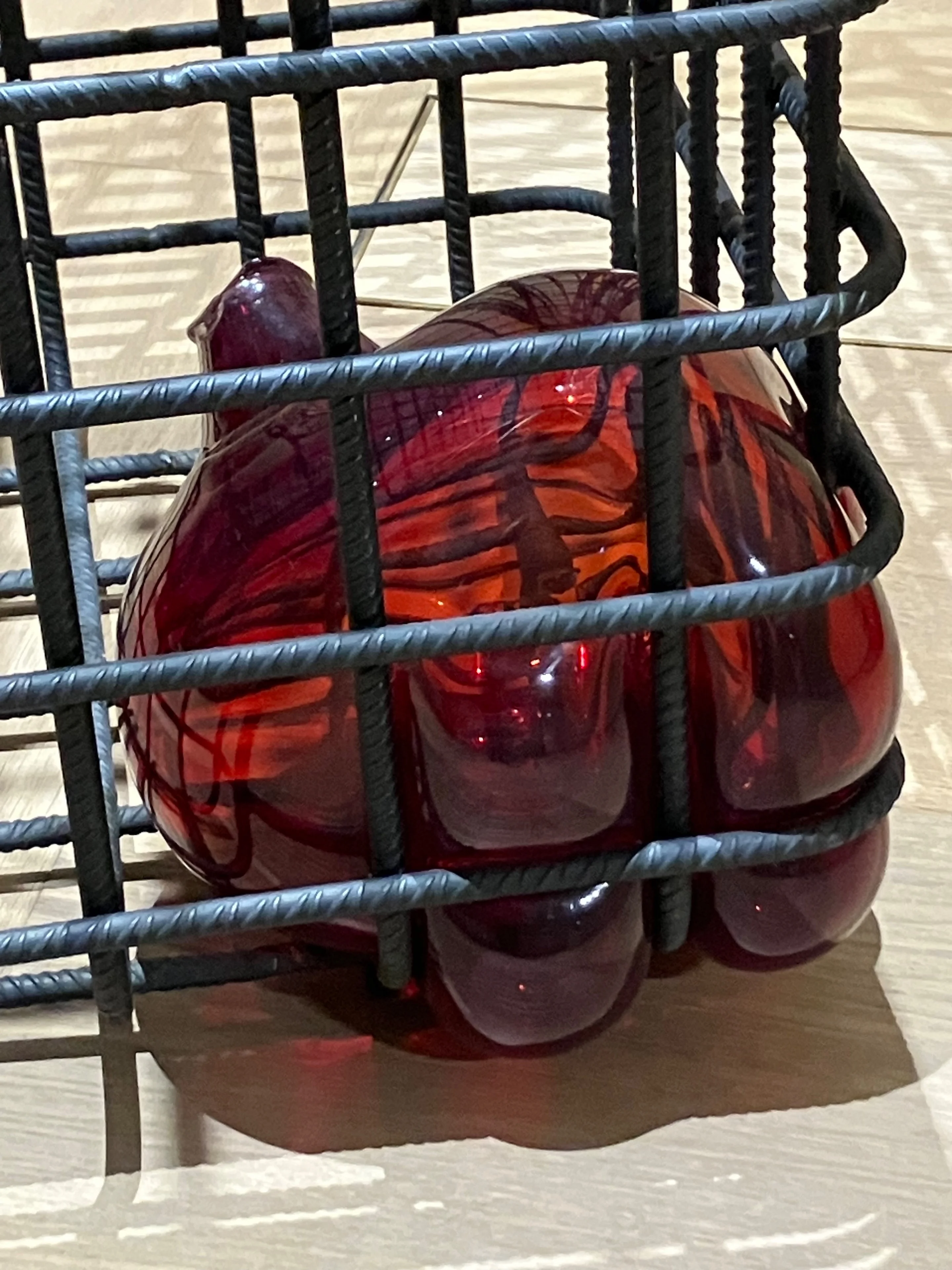 Dem entsprechen Vieldeutigkeit und Vielschichtigkeit mancher in Zürich präsentierter Installationen. «Cellules» zum Beispiel ist eine Gruppe von sechs leicht schiefstehenden käfigartigen Stelen unterschiedlicher Höhe aus Armierungseisen. Sie nehmen je ein oder mehrere mundgeblasene runde Objekte aus tiefrotem Muranoglas auf, die sich gegen die Eisenstäbe zu drängen scheinen, dem Käfig entrinnen wollen, aber gewaltsam daran gehindert werden. Die blutroten Objekte erinnern an verletzliche menschliche Organe. Wir werden Zeugen zerbrechlichen Lebens, das sich nicht entfalten kann. Weiches sucht sich gegenüber Härte durchzusetzen.