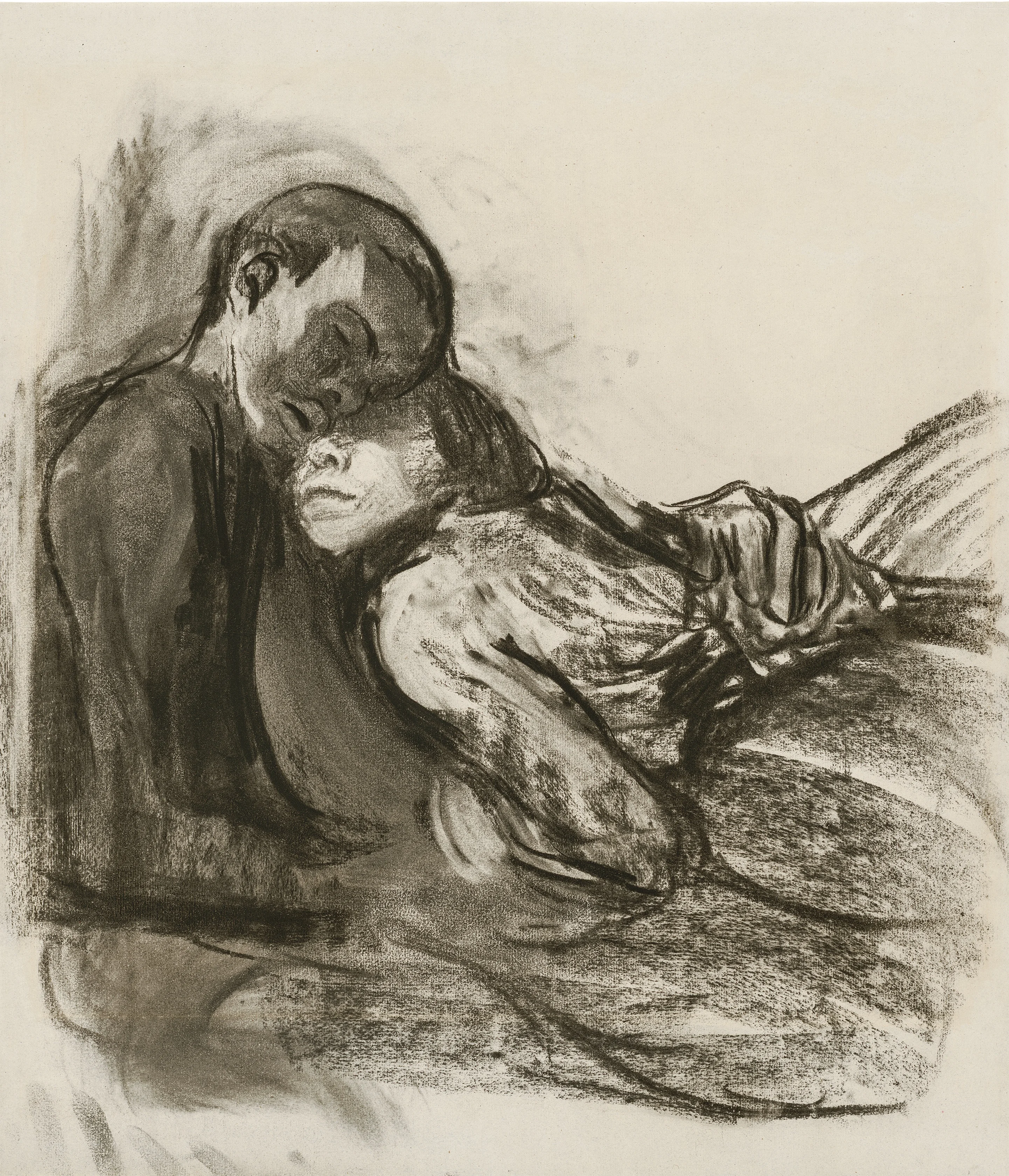 Weitere Schwerpunkt sind der weibliche Akt sowie – auch das emotional aufgeladen – das Thema Mutter und Kind sowie die Auseinandersetzung mit dem Thema Tod. Deutlich macht die Zürcher Präsentation auch, in welchem künstlerischen Umfeld ihrer Zeit sich Käthe Kollwitz vernetzt fühlte. Da liessen sich Karl Stauffer-Bern (1857–1891) nennen, bei dem sie in Berlin Unterricht nahm, oder der rund zehn Jahre ältere Max Klinger (1857–1920), dessen Radierfolgen (zum Beispiel «Ein Leben») sie beeinflussten, und schliesslich Max Liebermann (1847–1935), die weitgehend unumstrittene grosse Instanz der Berliner Malerei seiner Zeit. Liebermann, mit dem sie in der Berliner Akademie in engem Kontakt stand, förderte sie.