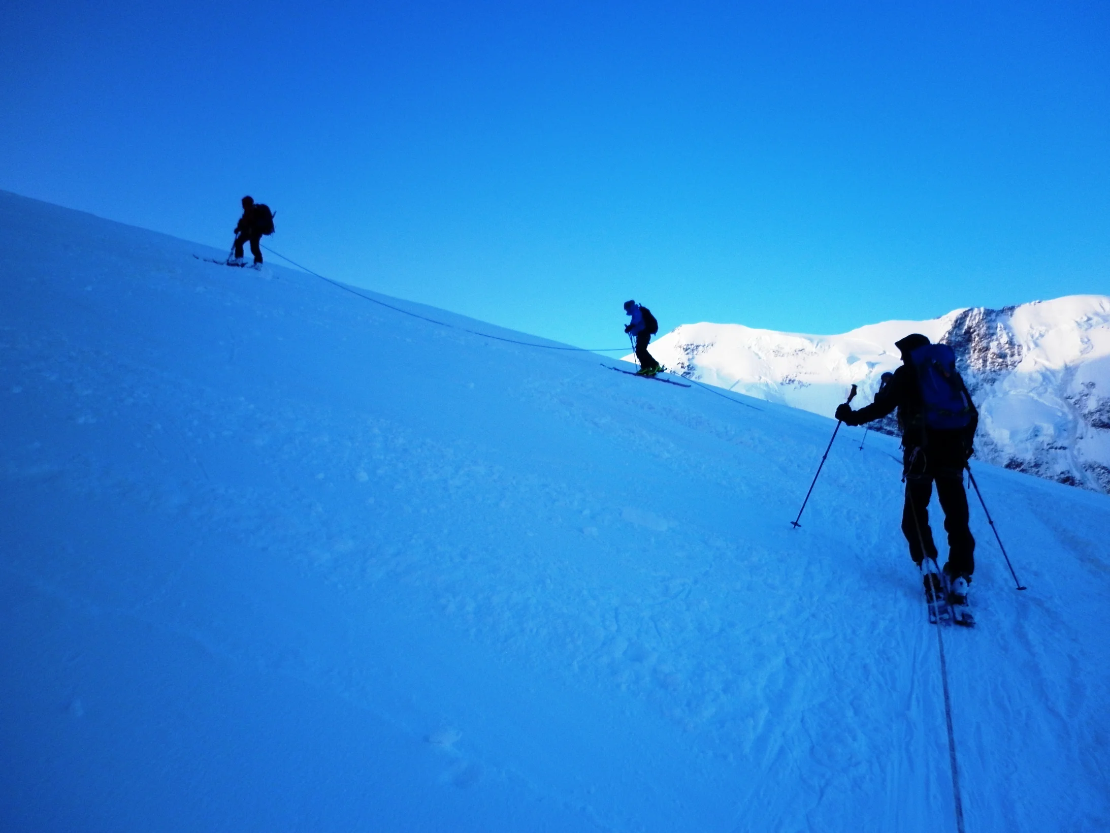 Die Tagwacht ist ein Ruf in der Dunkelheit um vier Uhr. Die Skischuhe in der niedrigen Schneehöhle anzuziehen, erweist sich als unmöglich. Also in den Innenschuhen hinaus in den Schnee. Draussen beissende Kälte und Stirnlampen, die die Dunkelheit quer und kreuz durchschneiden. Balancieren auf einem Bein, um den Klettergurt anzulegen. Stolpern über Seile und Material. Das Eis von den Skiern kratzen, um die Felle anzudrücken. Ein Paar nasse Handschuhe blieben versehentlich draussen und sind zu steifen Brocken gefroren. Es dauert seine Zeit bis die Seilschaften gebildet sind und sich langsam in Bewegung setzen. Eine Kette von Lichtern in der Dunkelheit.