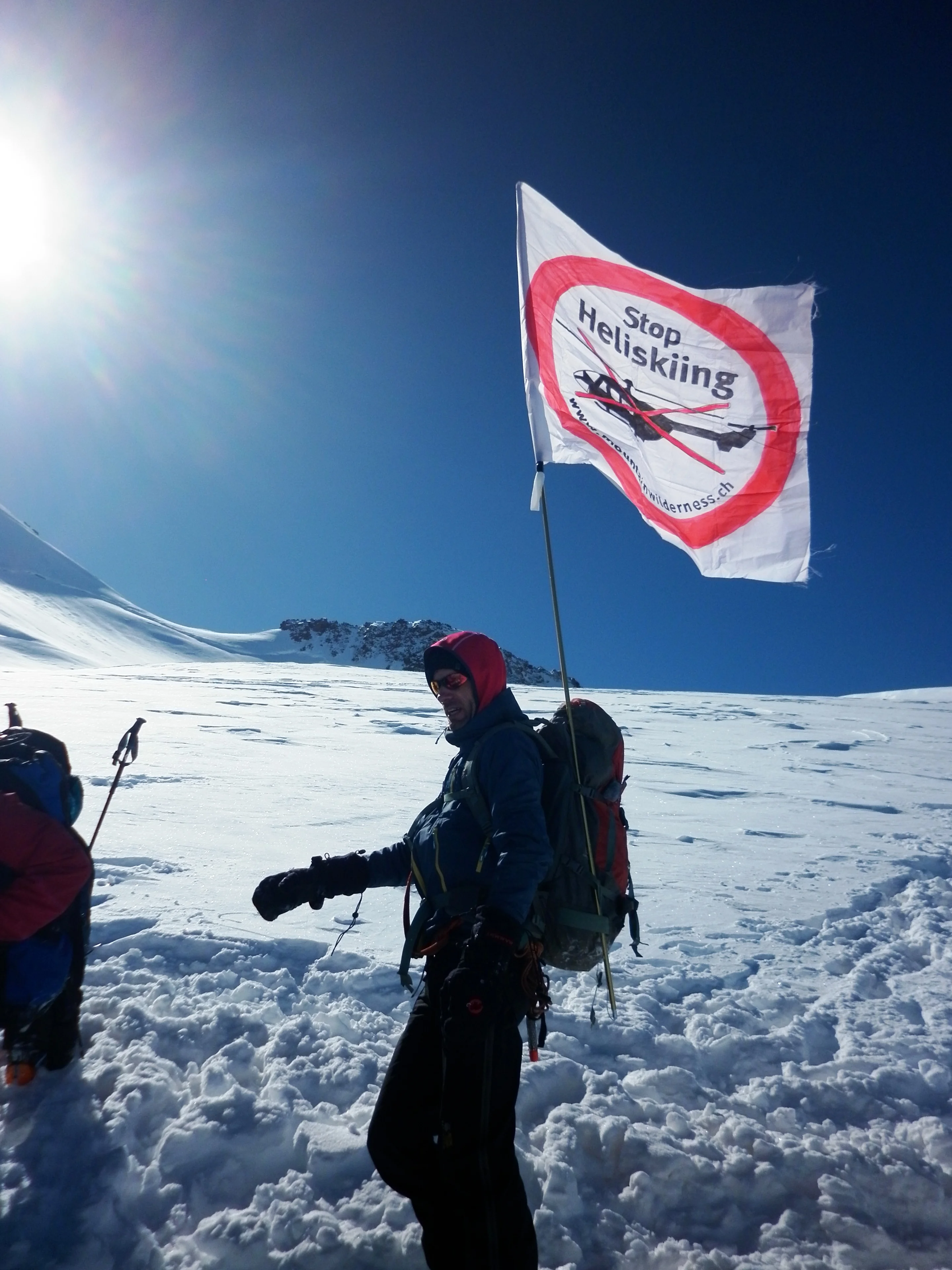Gegen halb neun gelangen wir auf die sonnige Gletschermulde, wo der offizielle Heli-Landeplatz liegt. Er ist mit Fähnchen markiert. Hier oben, unter der eisig gleissenden Wand des Vorgipfels der Dufourspitze und den gewaltigen Eisbalkonen, die vom Silbersattel herabhängen, geht ein leichter, aber kalter Wind. Wir wählen unsere Positionen und spannen die Transparente: „Stop Heliskiing am Monte Rosa“