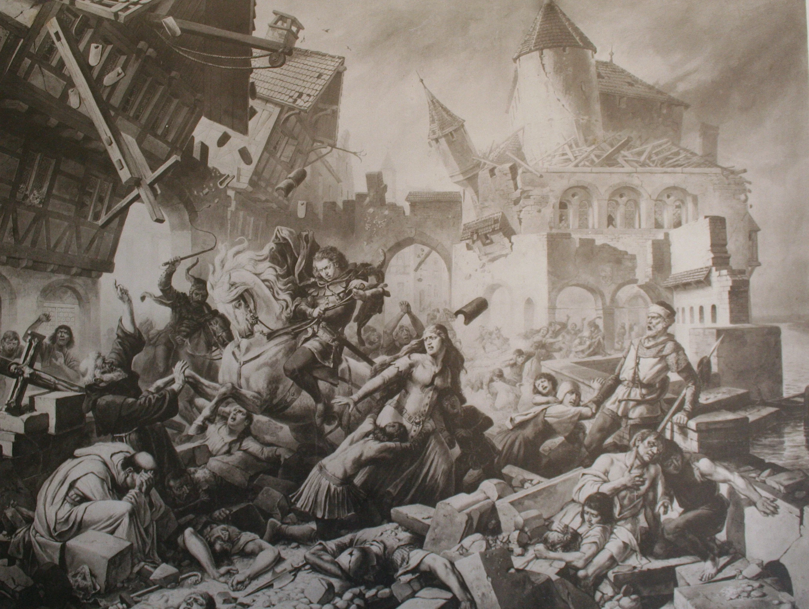 In seinen Bildern wimmelt es von Helden. Nur einmal zeigt er auch die Schrecken des Krieges. Die Botschaft ist wohl: Zerstrittenheit bringt den Tod.