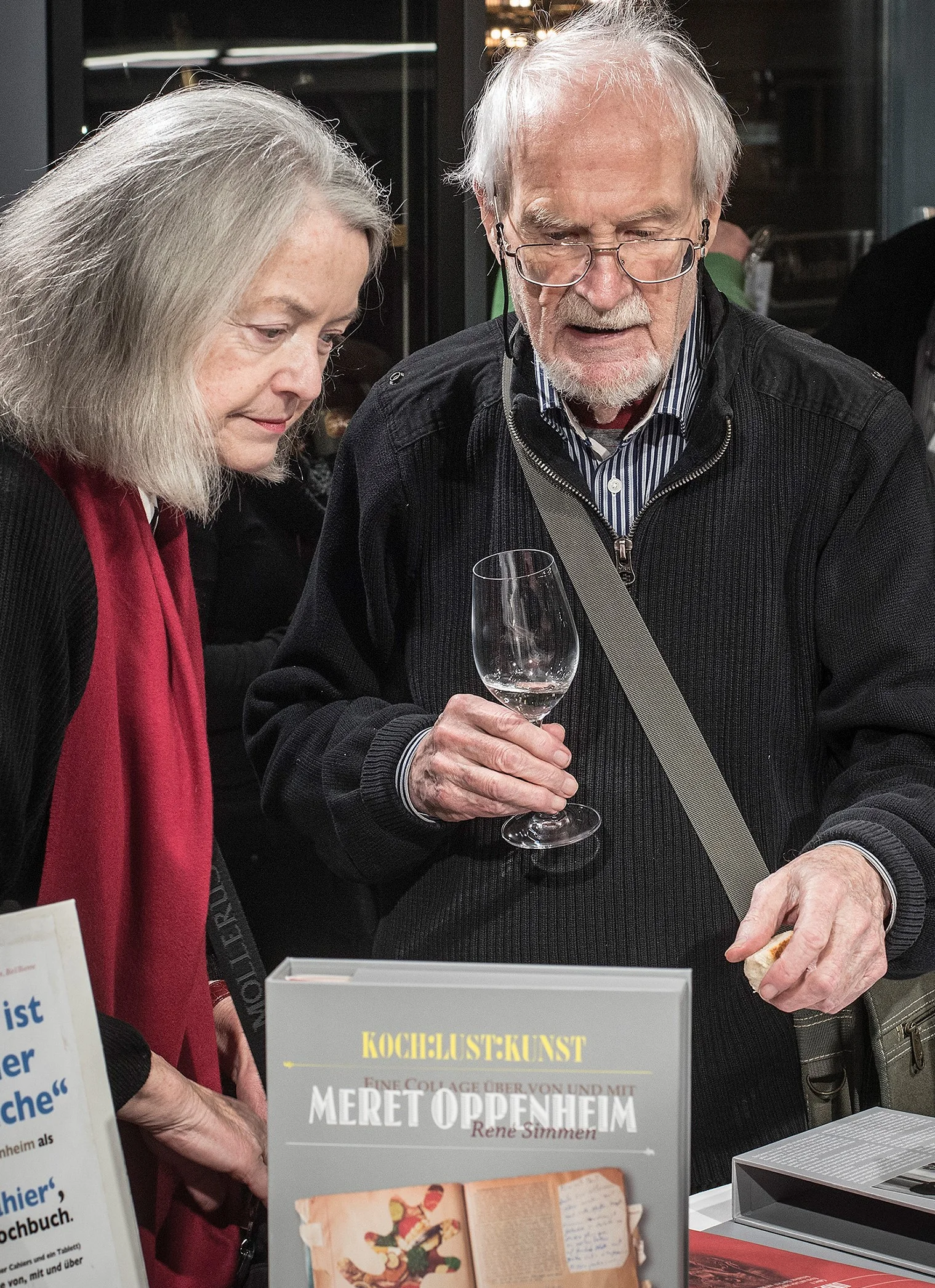 Und damit sind wir schon in Bern, wo Meret Oppenheim von 1949 bis 1967 gelebt hatte. Hier in Bern kreuzte sich ihr Weg immer wieder mit dem von René Simmen. (Im Bild: Simmen mit unserer Autorin Annette Freitag.) Simmen ist Buchhändler, Schriftsteller, Koch, Gastrokritiker und Lebenskünstler und inzwischen über 90 Jahre alt. Er ist einer, der sich sein Leben lang mit den wundersamen Geheimnissen der Kunst des Kochens beschäftigt hat, mit einem ausgeprägten Sinn für Schönes und Schräges, für Gutes und Aussergewöhnliches, aber auch für Lustiges und Verschrobenes. René Simmen und Meret Oppenheim mussten sich früher oder später begegnen, damals im kleinen Bern, so ähnlich wie ihre Interessen waren.
