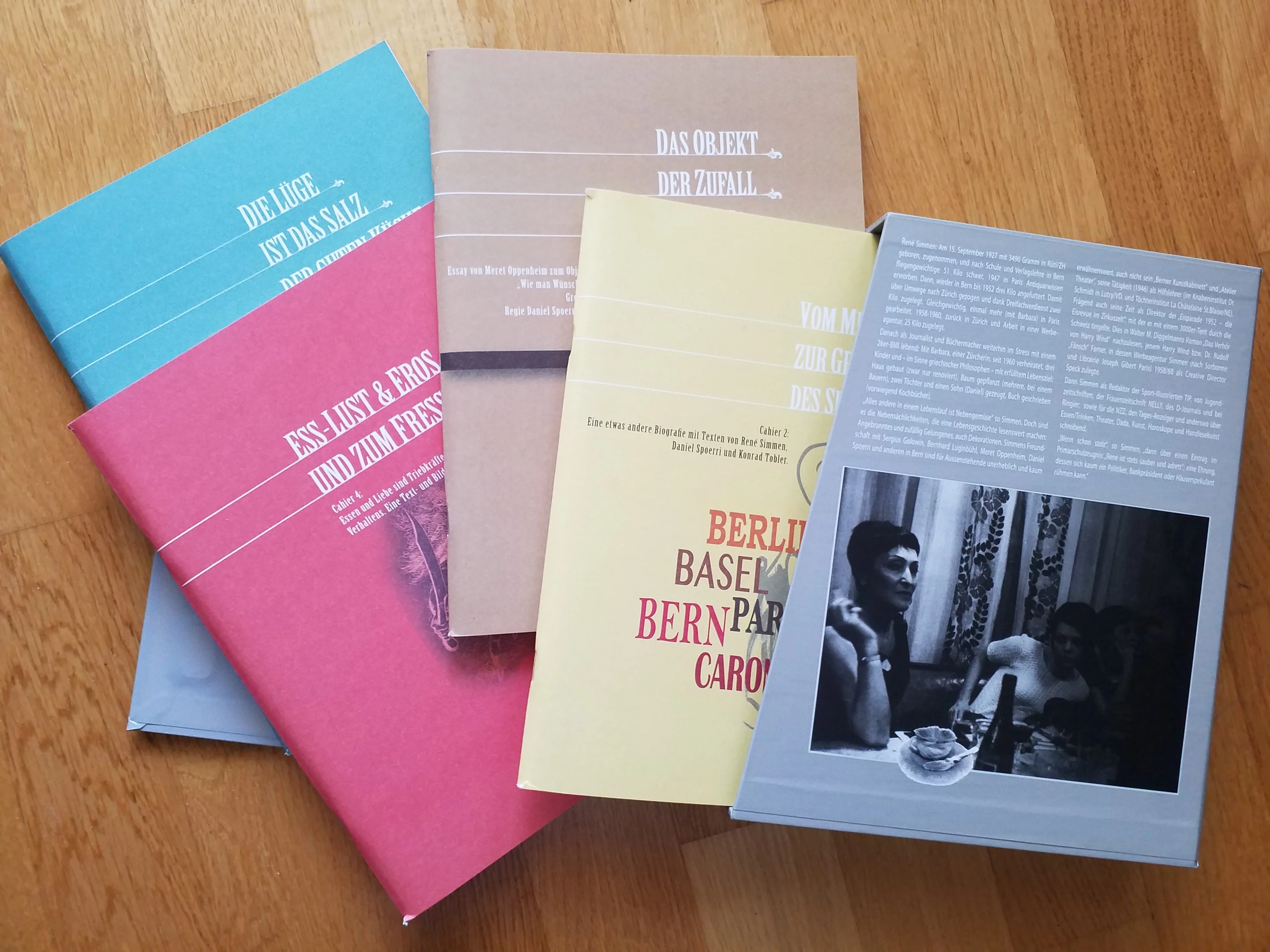 Durch Vermittlung von Silvio – auch er seit Jahren zwischen Kunst und Literatur tätig – kam nun Judith Luks ins Spiel, die Leiterin der «edition clandestin» in Biel. Ein erstes Treffen zwischen ihr und René Simmen fand natürlich in der «Bodega» statt. «Da hat mir René diese ‘cahiers’ von Meret Oppenheim gezeigt, und für mich war klar, das wird am Schluss kein Buch sondern eine Art Collage …» Judith Luks hörte fasziniert zu, was René Simmen sich dazu ausgedacht hatte. «René wollte vier Hefte daraus machen, einen Umschlag hatte er schon entworfen. Ich habe ihn dann auch zuhause besucht und sah, dass er Berge von Material hatte!» Es wurden weitere Leute beigezogen: Heike Eipeldauer, Kuratorin am Kunstforum Wien, Daniel Spoerri, der mit seinen Eat-Art-Kunstwerken bekannt wurde, und Konrad Tobler, Kulturjournalist und -vermittler in Bern. Und René Simmens Sohn Daniel beteiligte sich an der grafischen Gestaltung. «Es hat Mut gebraucht», sagt Verlegerin Judith Luks, «es wurde ausufernd. Und für die junge Generation ist Meret Oppenheim heute kaum mehr ein Begriff.» Es war ein langer Prozess vom flüchtigen Gedanken zum handfesten Buch.