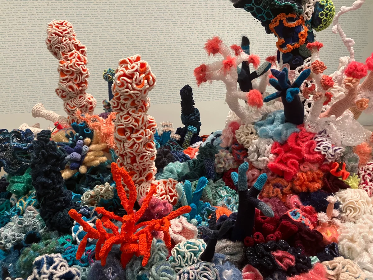 Schlicht schön wirkt, was die Australierinnen Margaret und Christine Wertheim – Zwillingsschwestern, Künstlerinnen und zugleich Naturwisssenschafterinnen – präsentieren: Die bunten, anscheinend wild wuchernden Skulpturen aus eingefärbten Textilfasern sind Teil ihres langfristigen und weltweit angelegten Projektes «Crochet Coral Reef». Als Wissenschafterinnen widmen sie sich der Ästhetik mathematisch-naturwissenschaftlicher Theorien, in ihrer künstlerischen Praxis verknüpfen sie die traditionelle Handarbeit des Häkelns mit der Schönheit bedrohter Unterwasserlandschaften der Korallenriffe. Ihr Kunstwerk baut auf Partizipation. Die Wertheim-Schwestern beziehen zahlreiche Mitarbeiterinnen und Mitarbeiter aus aller Welt in die Arbeit und auch in die Entscheidungsprozesse ein, womit sie ihren eigenen Status als Künstlerinnen relativieren.