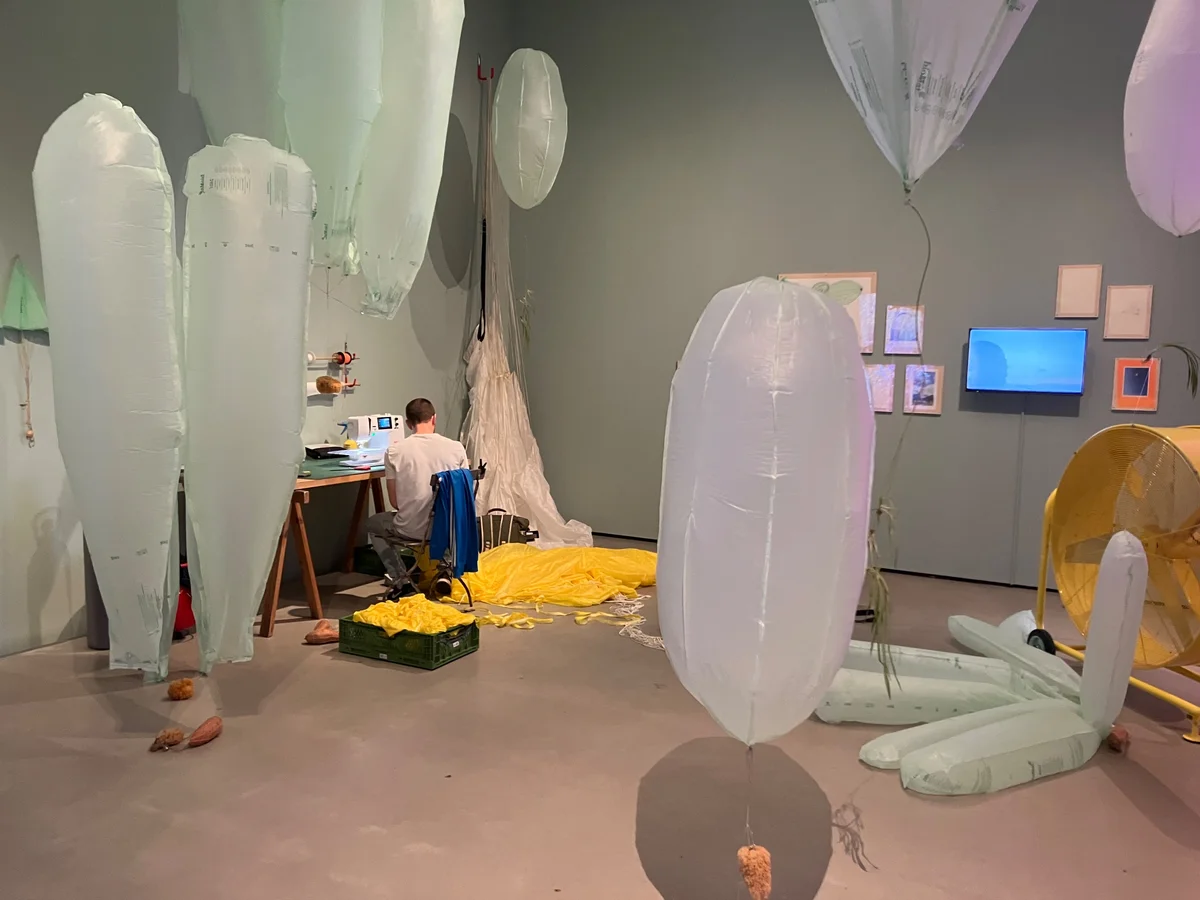 Poesie zeichnet die Arbeit des Düsseldorfers Thomas Kleiner aus, der sein Atelier temporär in die Kunsthalle Mannheim verlegt und sich hier der Anfertigung seiner Flugkörper widmet. Er stellt Ballons aus Bioplastik-Folie her, füllt sie mit Helium und beschwert sie mit einer Kartoffel oder einer Zwiebel als Ballast. Er sucht so nach einem Gleichgewicht zwischen Last und Auftrieb. Die Ballons schweben frei im Raum, bewegen sich mitunter sanft – oder auch, unvorhergesehen, rasch. So entführten die in den weiten Räumen der Kunsthalle herrschenden Luftströmungen einen dieser Ballons zur Freude des Künstlers in die entlegensten Winkel des Gebäudes. Die Flugkörper haben ihr eigenes Leben, denn die Verhältnisse verschieben sich. Die Ballast-Kartoffeln trocknen und verlieren an Gewicht, das Helium entschwindet allmählich durch die Poren der Folien. Thomas Kleiners Suche nach dem Gleichgewicht gewinnt im Kontext der Klimadiskussion durchaus metaphorischen Charakter. Darüber, dass er mit seiner Arbeit nicht das ganz grosse Publikum anziehen kann, ist sich der Künstler im Klaren. Dadurch, dass er in der Ausstellung selber präsent ist und sich auf kommunikative Weise auch Fragen der Besucherinnen und Besucher stellt, gewinnt seine Arbeit an Echo.