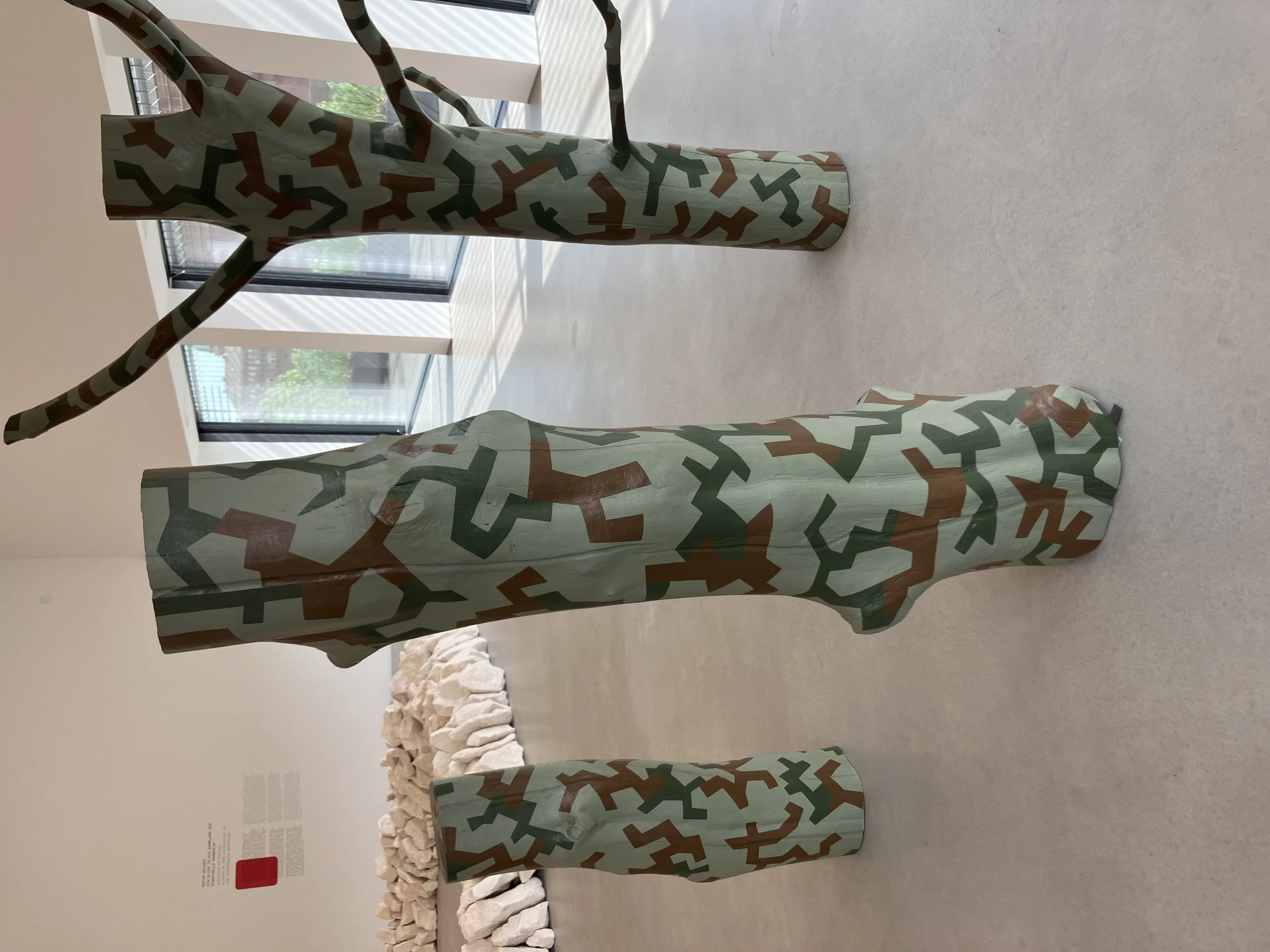 Überzeugend und auf Anhieb einsichtig tut dies übrigens ein vor über 50 Jahren entstandenes Werk der Mannheimer Sammlung: Timm Ulrichs’ «Natur-Teile». Der 1940 geborene «Totalkünstler», wie er sich nennt, der Konzeptkunst und dem Neo-Dadaismus verpflichtet, Liebhaber von Mehrdeutigkeiten und Paradoxien, entrindete 1968 drei Baumstämme und versah sie mit einem Tarnanstrich, wie ihn die Armee verwendet. Üblicherweise macht Tarnung mit einem der Natur entlehnten Design den Menschen unsichtbar, um ihn zu schützen. Timm Ulrichs tarnt die Natur und schützt sie – vor den Menschen.