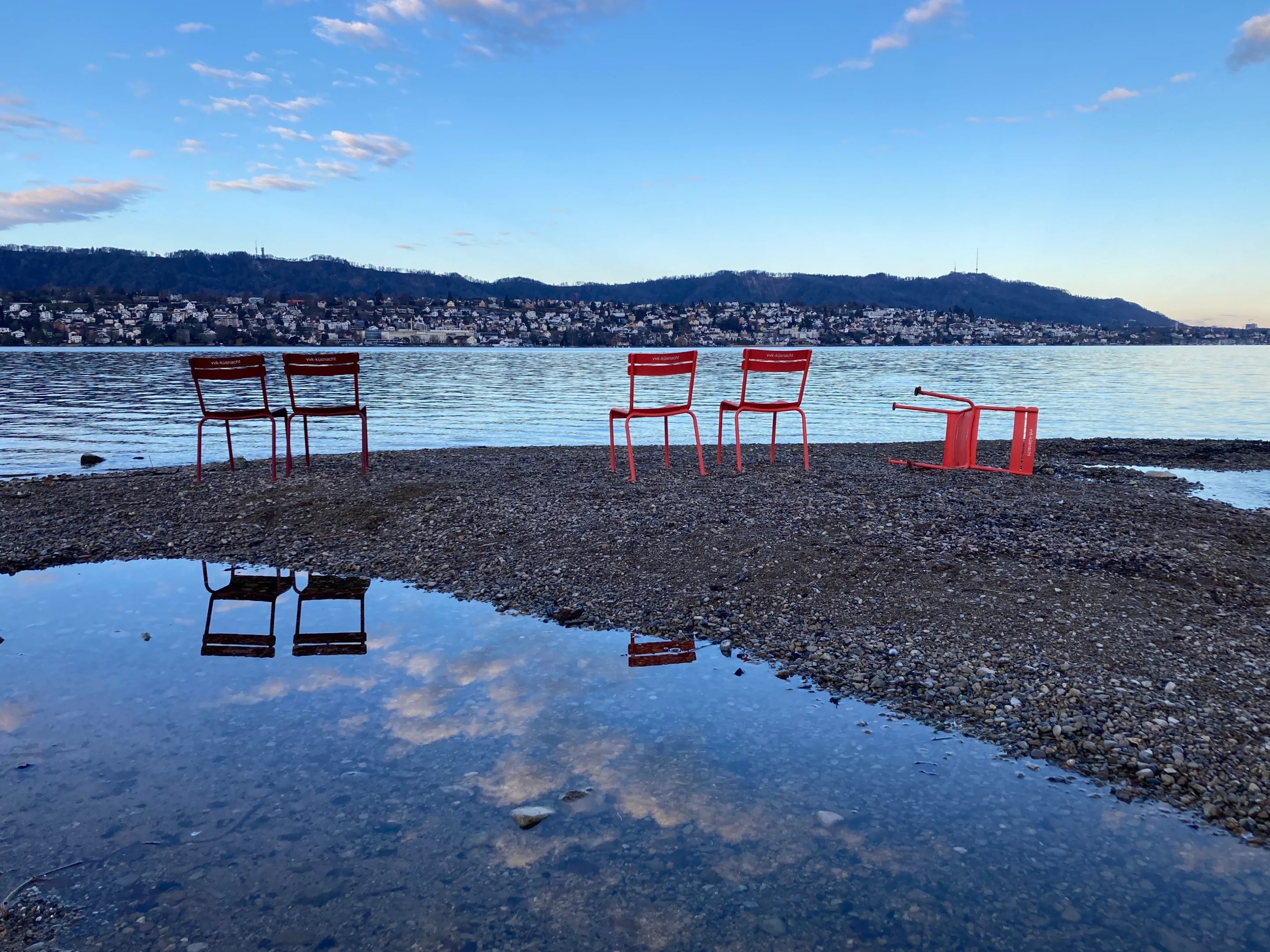 Rote Stühle am Ufer! – Ich komme ins Grübeln und frage mich: Was ist eigentlich ein Stuhl? Was ist das Gemeinsame hinter einem Gartenstuhl, Lehnstuhl, Liegestuhl, Schaukelstuhl, Klappstuhl, Coiffeurstuhl. Rollstuhl, Kinderstuhl oder Nachtstuhl?