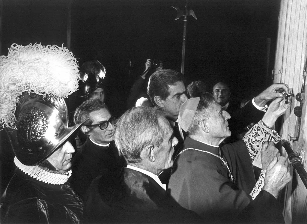Das Bild stammt vom 14. Oktober 1978. Der Geistliche Jacques Martin verschliesst die Tür. Gewählt wurde damals Karol Józef Wojtyła, der als Johannes Paul II. das zweitlängstes Pontifikat der Geschichte (9.665 Tage) antreten sollte. (Foto: Keystone/EPA ANSA/STR)
