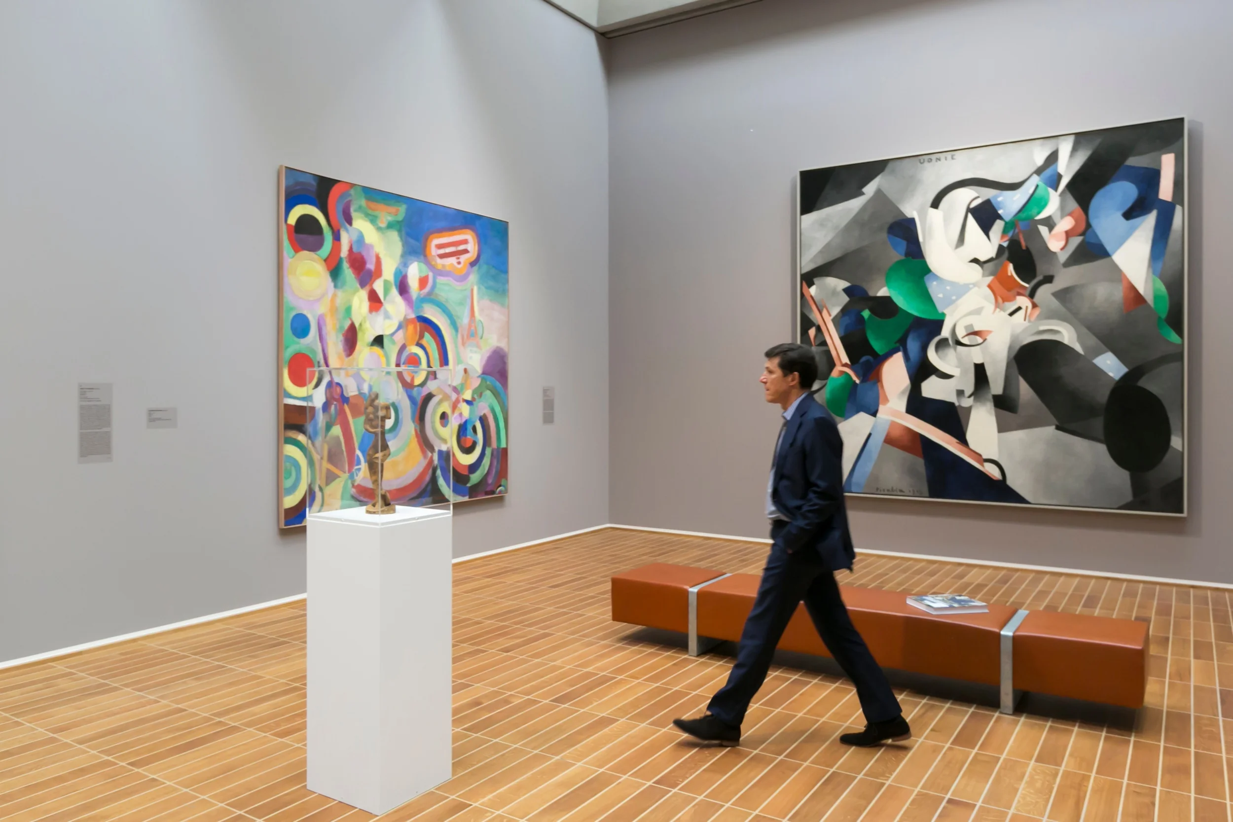 Ausstellungsansicht: links „Hommage à Bleriot“ von Robert Delaunay (1914), rechts „Udnie (Junges amerikanisches Mädchen; Der Tanz)“  von Francis Picabia. 1913. Centre Pompidou. Paris. Bild: Julian Salinas