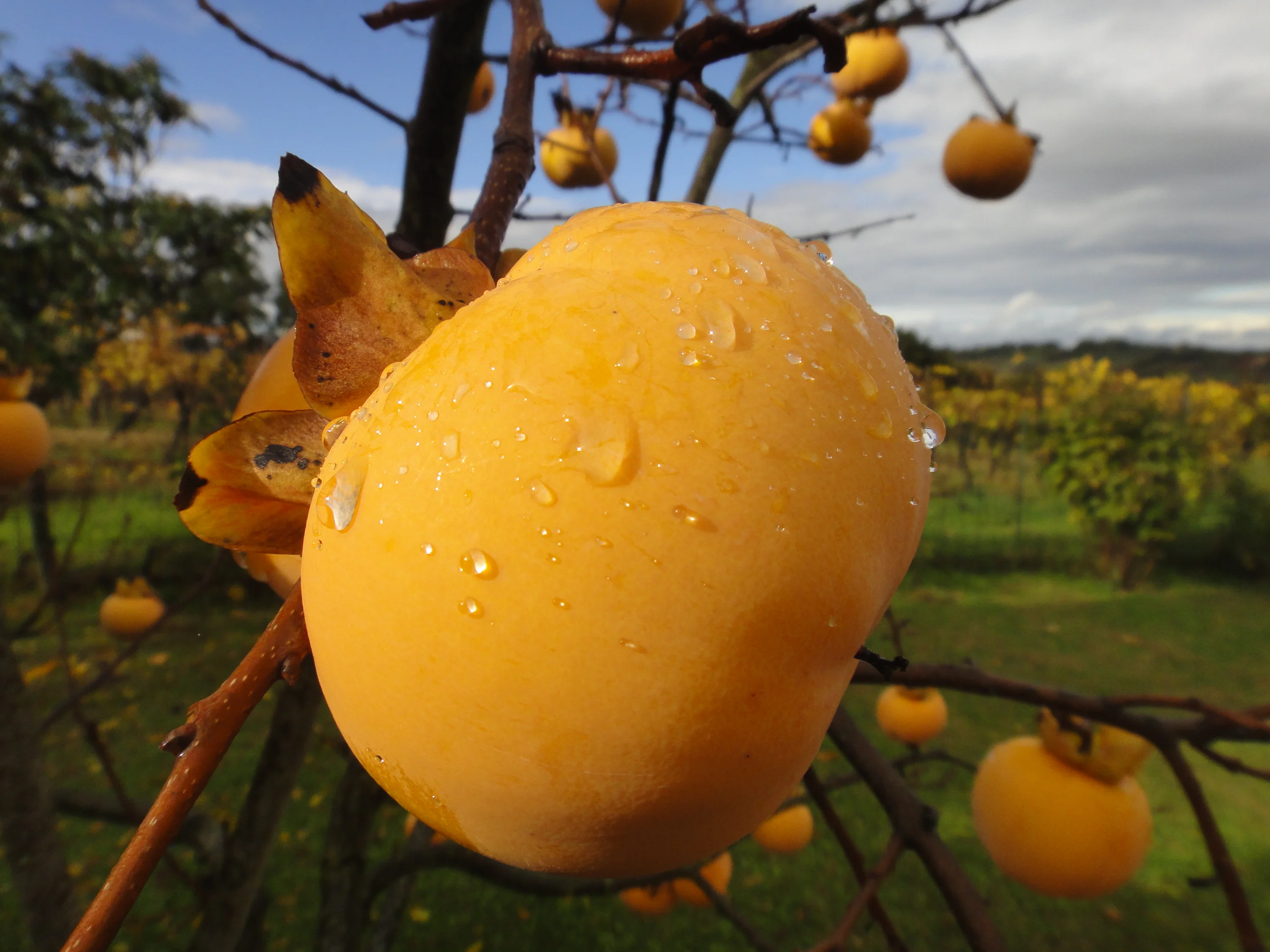 Im Oktober werfen die Bäume plötzlich ihre grossen Blätter ab. Dann steht nur noch das Baumgerüst mit seinen magischen Früchten. Je kälter es jetzt wird, desto besser werden sie. Die Fröste entziehen ihnen ihren herben Geschmack.
