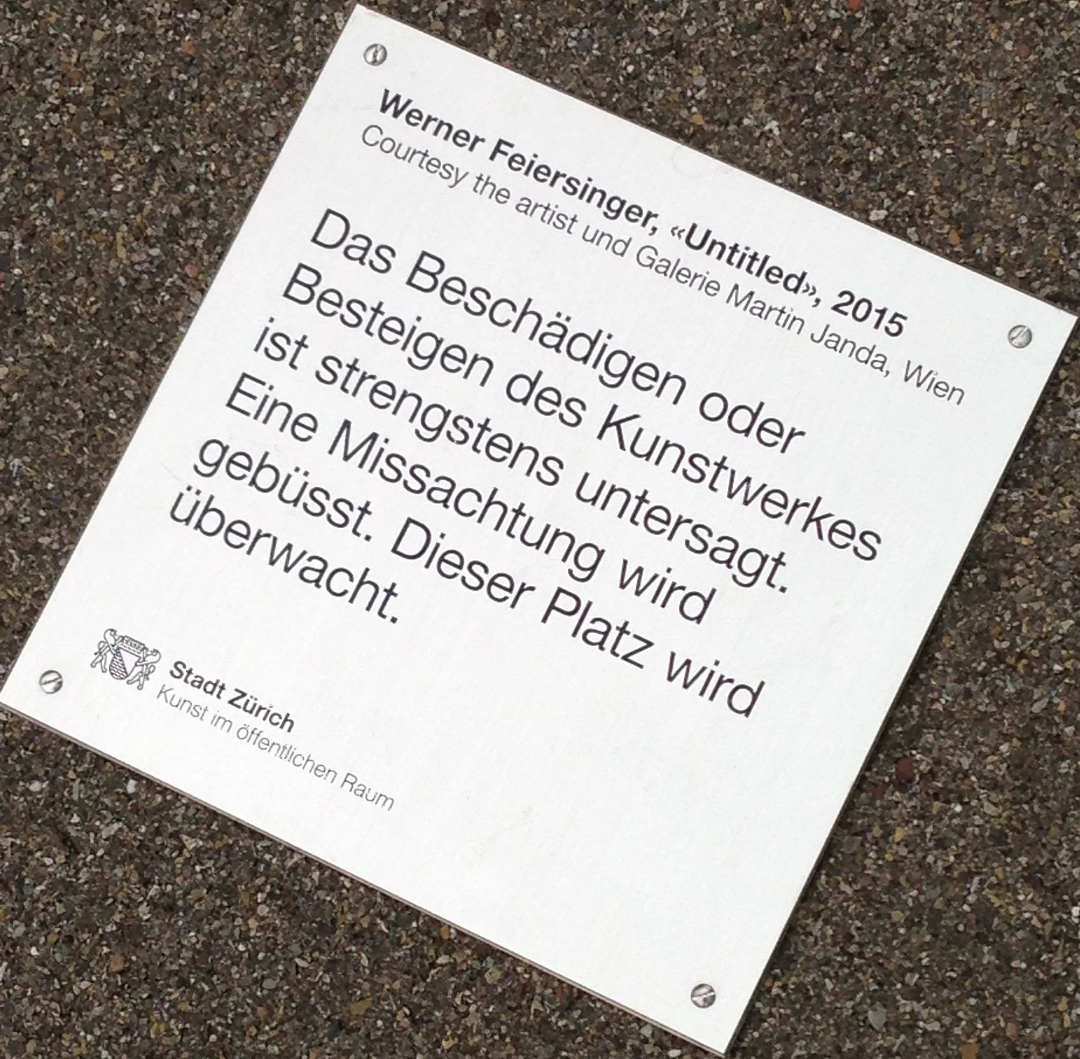 Den Werterhalt von «Untitled, 2015» hat sich das zuständige Amt der Stadt Zürich zur Herzensangelegenheit gemacht. Mit einer sauber am Boden festgeschraubten amtlichen Plakette, und zwar gleich in zweifacher Ausführung an beiden Enden des Gestells oder der Leiter, wird das «Beschädigen oder Besteigen des Kunstwerkes» (man beachte das subtil museale «-werkes») nicht einfach nur verboten, sondern «strengstens untersagt.» Damit nicht genug. «Eine Missachtung wird gebüsst», heisst es weiter. Aus dem Textzusammenhang geschlossen, kann nur die Missachtung des Kunstwerkes gemeint sein. Man hüte sich also, es mit abschätzigem Blick herabzuwürdigen. Und das ist tunlich ernst zu nehmen, denn: «Dieser Platz wird überwacht.»