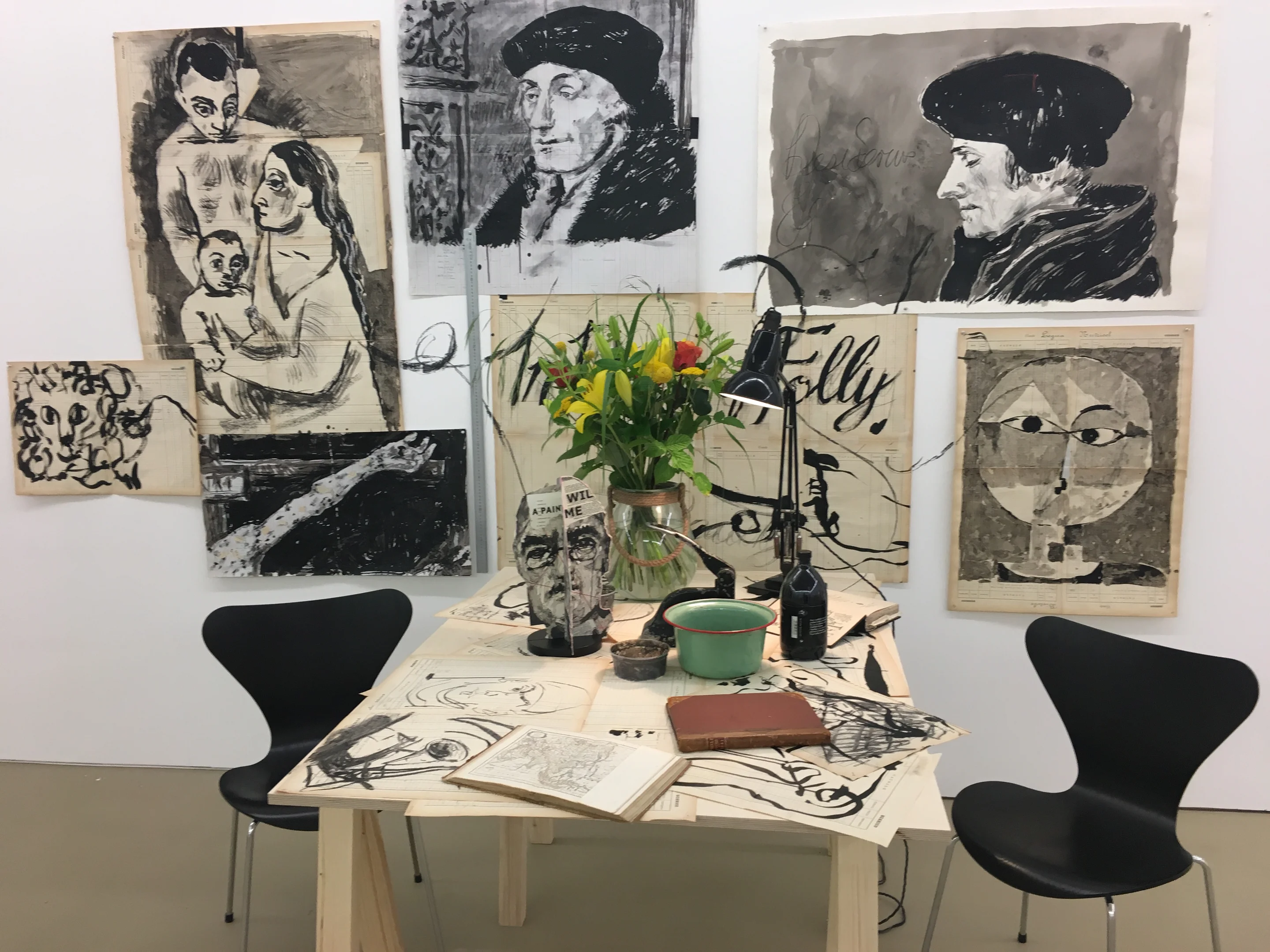 Im gleichen Raum findet sich die Rekonstruktion von Kentridges Studio „Drawing Lesson: Learning from the Old Masters“. Hier nimmt der Künstler mit Zeichnungen nach Werken Holbeins, Picassos und Klees aus der Basler Sammlung direkt Bezug zum Ausstellungsort. Oft legt Kentridge auch Fixpunkte in der Kunstgeschichte offen. Er sucht sie weniger in der unmittelbaren Gegenwart mit Konzepten oder Reduktionen, sondern vielmehr im Dadaismus, in der Moderne der 1920er-Jahre und in expressionistischer Gegenständlichkeit – und damit in einer Zeit künstlerischer und politischer Verwerfungen. Es ist auch kaum Zufall, dass er 2005 den Max-Beckmann-Lehrstuhl der Frankfurter Städel-Schule innehatte.