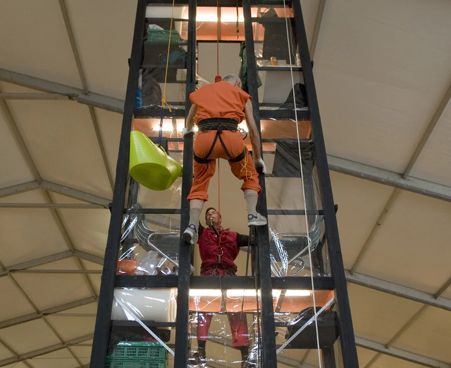 Zurück zu den Messen: Wenn man nicht mit dem durch Schnäppchenhunger verengten Tunnelblick durch die Ausstellungshallen hastet, hat man auch Augen und Zeit für spezielle Entdeckungen an den Messen. Ein scheinbares Trägerelement der Zeltkontruktion der ‚Scope’ wird dann als Wohnraum von zwei aneinandergeseilten soziale Strukturen durch die Beschaffenheit des Wohnraumes entstehen. Dem Betrachter wird bereits wegen des beengten und unstabilen Wohnraums unwohl, und genau dies wird auch bezweckt.