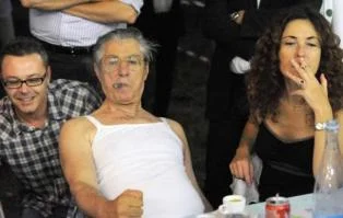 Il leader che si mostra in questo indumento intimo non ha più la forza simbolica della prima volta: appare nelle fotografie invecchiato, più simile a un pensionato che non al brillante provocatore politico degli ultimi vent’anni. Certo, allude ancora all’elemento popolare, com’è evidente dagli scatti che lo fissano sulla spiaggia ligure, attorniato da persone che vogliono farsi ritrarre insieme a lui, o accanto a giovani ragazze e militanti leghisti in t-shirt nel cremonese (la t-shirt è la versione rinnovata della canotta di Marlon Brando). Ma il gesto non è più quello di un tempo. La malattia l’ha reso legnoso, l’ha indurito. L’aspetto di maschera, che è sempre stato presente nella sua espressione e nella gestualità, si è fissato nella smorfia che l’ictus impietosamente ha impresso nel suo viso. Nelle foto in canottiera l’aspetto di santità, quel carisma che ancora conserva nei discorsi dal palco, si stempera e quasi scompare. O meglio: diventa il segno di una vistosa decadenza fisica, che finisce per sublimarne la figura, la santifica, almeno in parte, ma soprattutto la sposta fuori dal campo simbolico della politica in senso stretto.