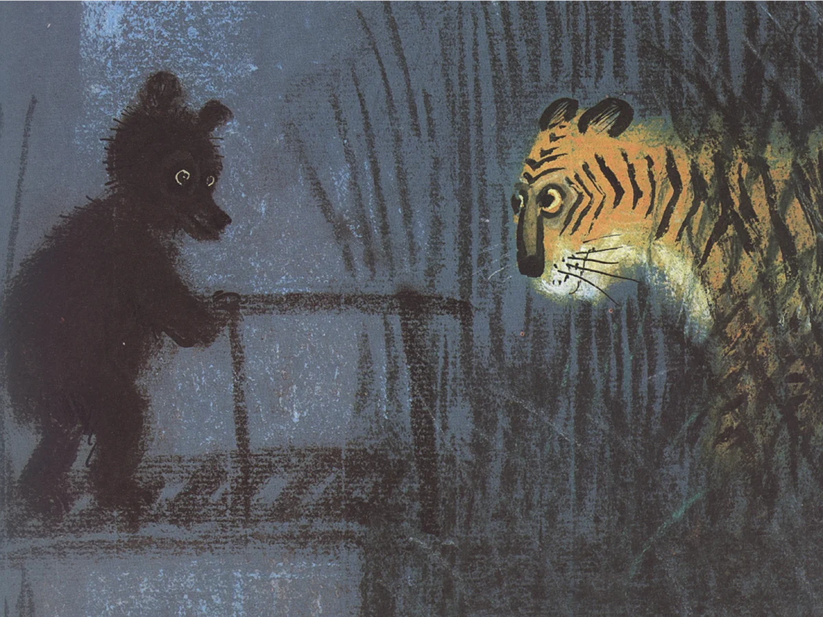 Der zweite Bär kommt ebenfalls behände voran. Da versperrt ihm ein Tiger den Weg. Auch er ringt mit dem robusten Tier, mobilisiert seine Bärenkräfte und kämpft sich so den Pfad zur Bergspitze frei. Der dritte Bär aber sieht den Tiger von Weitem. Angst überkommt ihn; er kehrt um und rennt zurück.