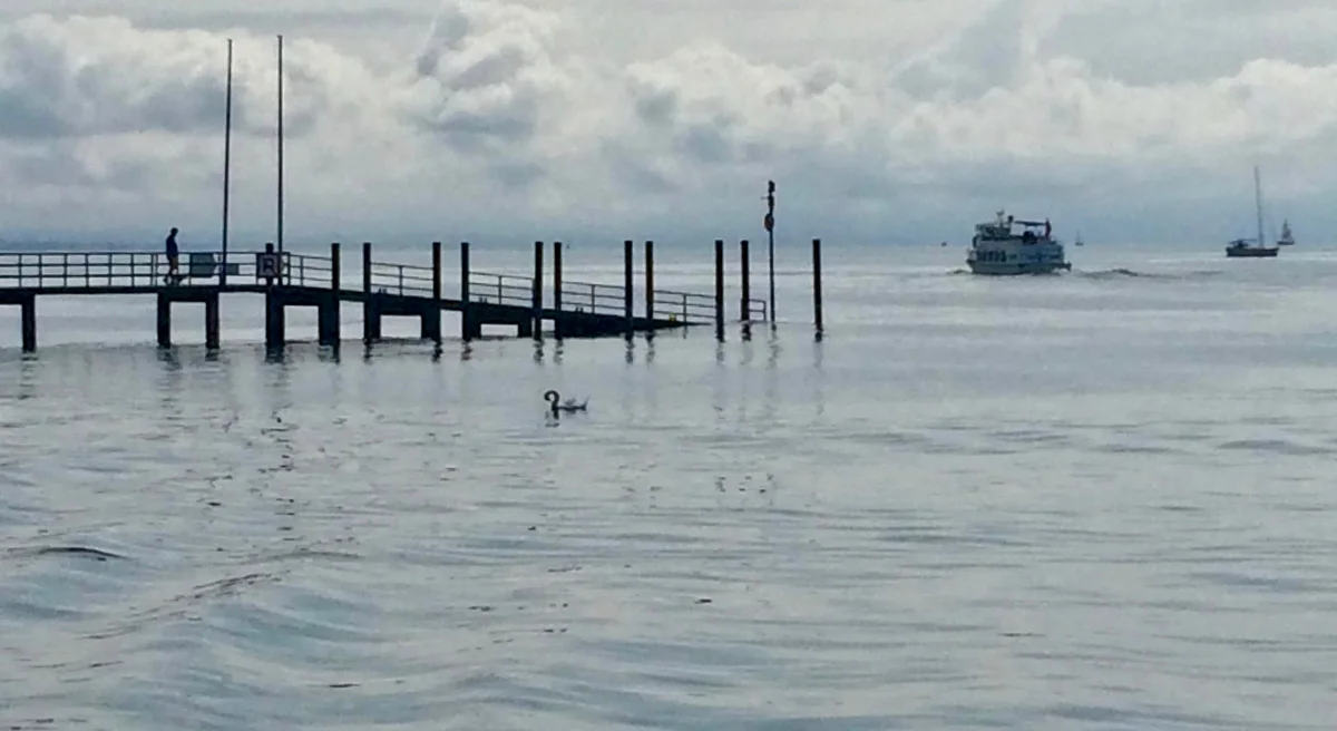 Weiter auf dem Uferweg, von dessen Länge die Anwohner des Zürichsees trotz Volksinitiativen nur träumen können. Am Landspitz, wo sich Konstanter Bucht und Überlingersee treffen, liegt ein wunderbar angelegtes Strandbad, das man als Wanderer durchqueren darf. Nach über einer Stunde Unterwegssein ist es Zeit für einen Kaffee auf der Terrasse des dortigen Restaurants. Hier sitze ich fast alleine. Sind die Konstanzer unterdessen durch das heisse Sommerwetter bereits so sehr verwöhnt, dass eine Wolkendecke, wie sie heute über dem See liegt, bereits schlechtes Wetter bedeutet?