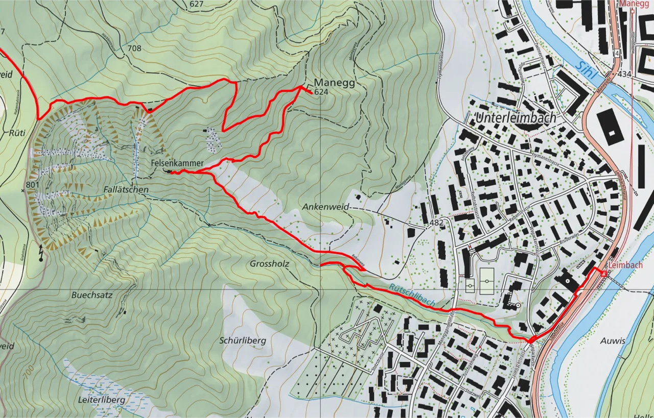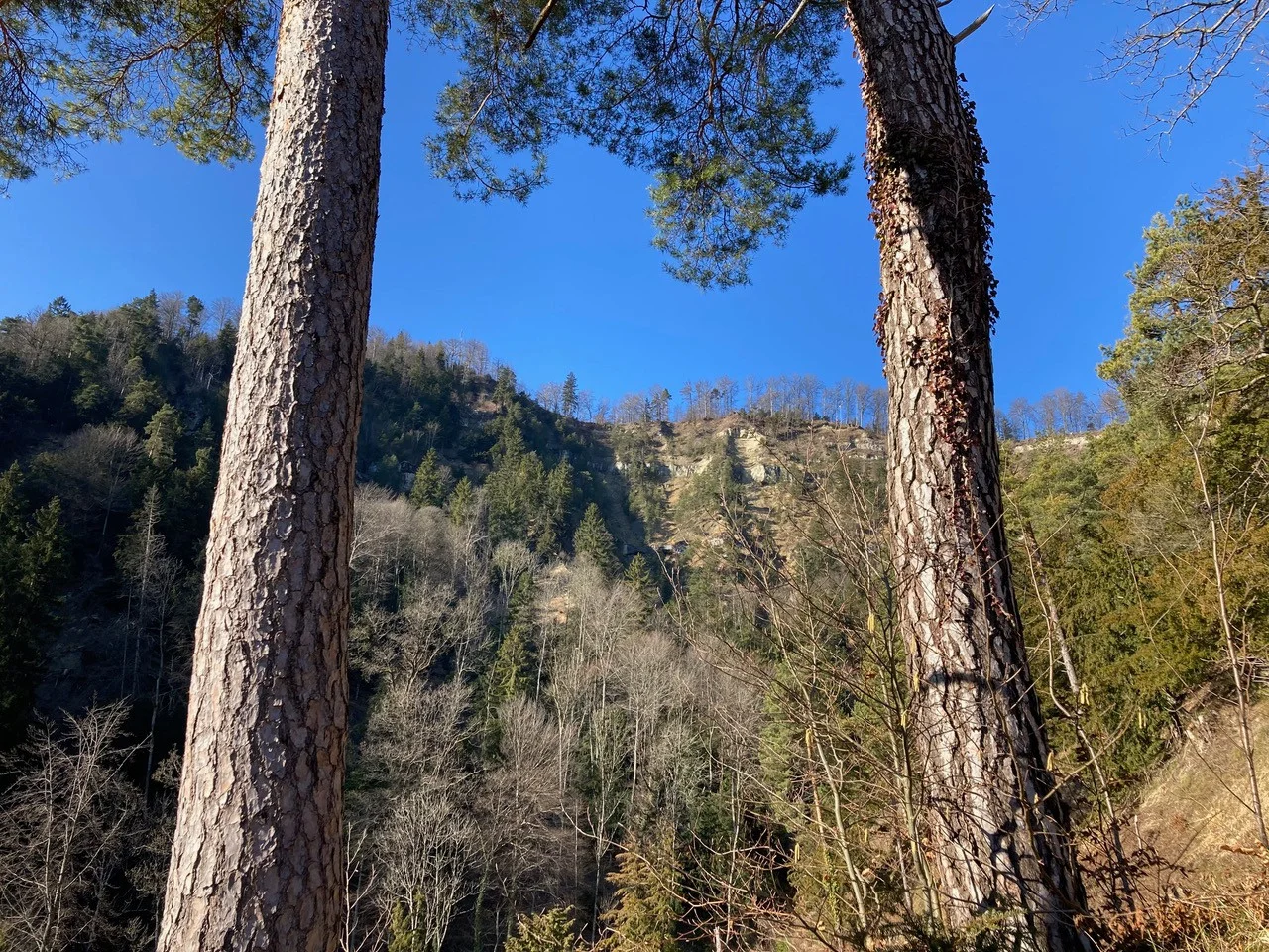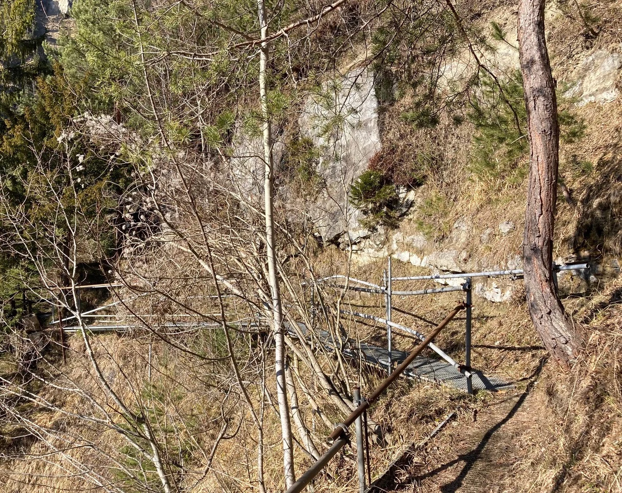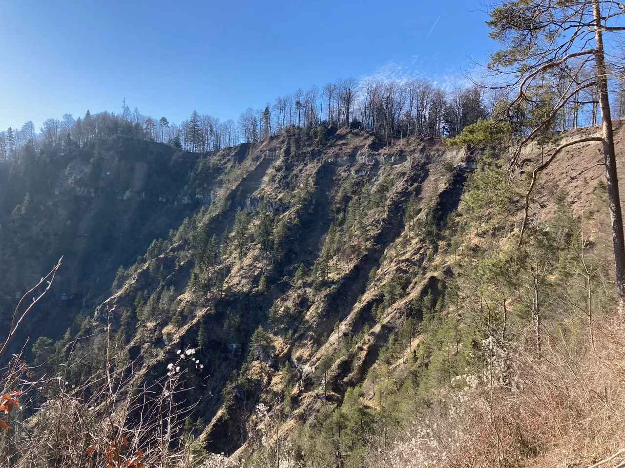 Wo der Weg den Bach überquert, sollte gemäss meiner Karte ein steiler Pfad entlang des Baches direkt ins Herz der Falätsche und weiter zur Felsenkammer führen. Doch man heisst nicht zufällig «Rütschlibach»: Aufgeweicht vom Schnee, der hier erst vor kurzem weggeschmolzen sein muss, hat sich der Weg entlang des steilen Bachbords in eine Rutschbahn verwandelt. Eingedenk all jener Wanderer, welche sporadisch – man liest es dann in den Zeitungen – durch die Feuerwehr oder mit Helikoptern irgendwo aus den Abhängen des Albis gerettet werden müssen, kehre ich – obschon mir das Umkehren im Leben immer schwer gefallen ist – nach den ersten Metern um, nehme ein kurzes Stück den Wanderweg Richtung Ankenweid und folge dann dem schmalen, aber trockenen Gratweg nordwestwärts hinauf zu jener Stelle, von wo man über den erwähnten Steg die Felsenkammer von oben her erreichen kann.