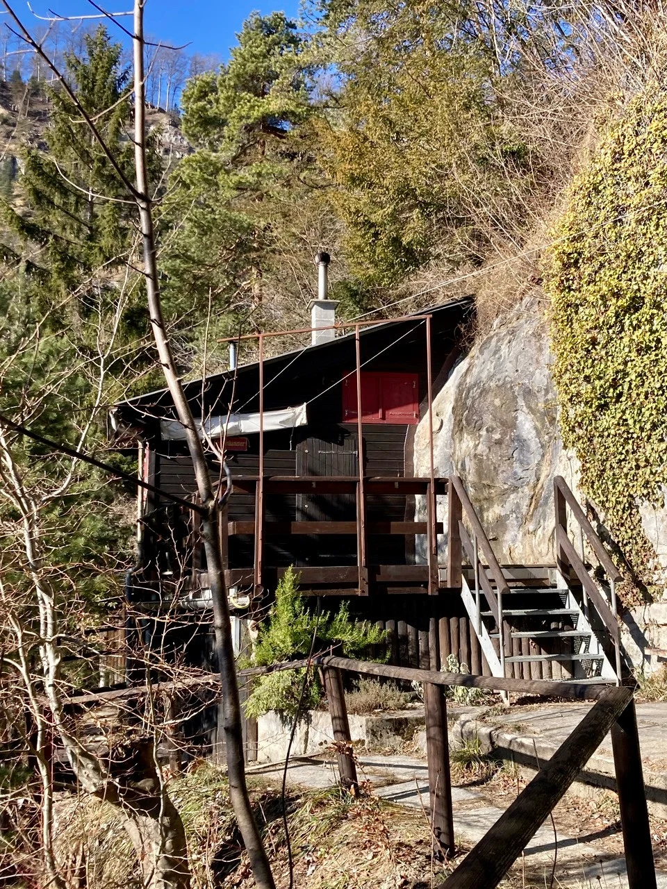 Hier hätte sie stehen können, die Lehmhütte, denke ich, oder auch weiter unten in der Schlucht. Allerdings wird die schäbige Behausung des Falätscher nicht so stabil, ja gut bürgerlich ausgesehen haben wie die Clubhütte des Alpenclubs Felsenkammer, die ich nach Überquerung des luftigen Steges hinter einer Geländekante im stotzigen Abhang erreiche.