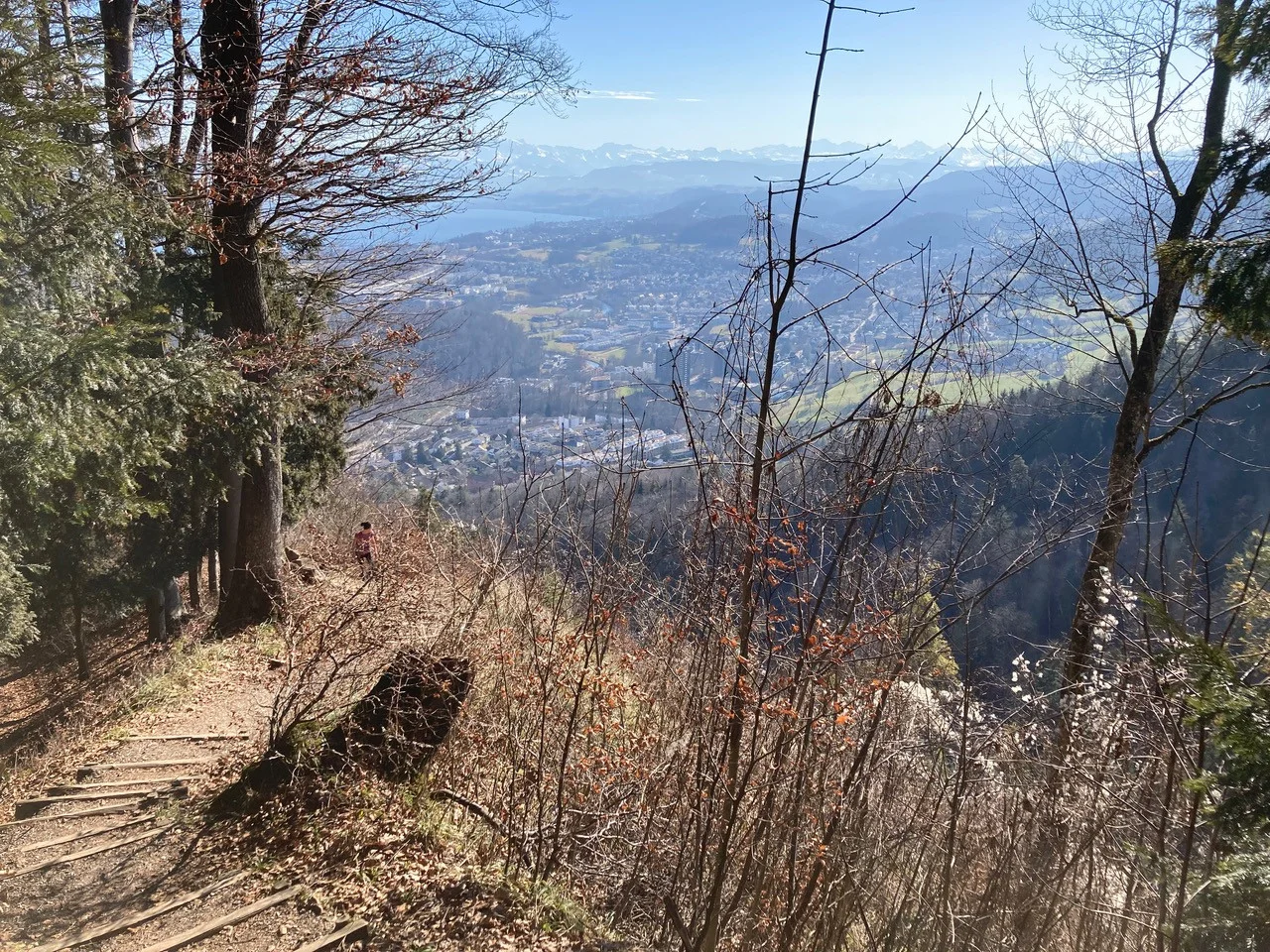 Fides und Johannes begleiten mich, als ich später auf dem steilen Weg entlang dem Rand der Falätsche zum Albisgrat gehe, einen kleinen Umweg zur «Teehütte» des «Alpenclubs zur steilen Wand» (3) mache und mich – nach meinem ganz privaten Abstecher in die Geschichte – auf dem Grat plötzlich und fast schockierend von Duzenden Wanderern umringt sehe, welche vom Üetliberg zur Felseneggbahn unterwegs sind. Ich beschliesse dem Strom entgegenzuschwimmen und wandere zur Station Uto Kulm, trinke im Restaurant Gmüetliberg noch einen Kaffee, bevor ich mich zusammen mit vielen andern, Familien mit Kindern, Pensionierten – allein oder in Jahrzehnte alter Zweisamkeit –, Liebespaaren, in die Üetlibergbahn zwänge.