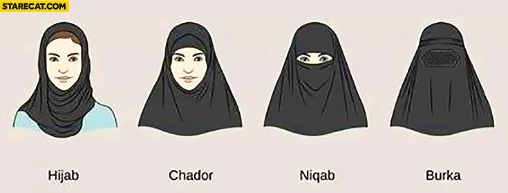 Beim Hijab, im Iran auch Tschador genannt, sieht das etwas anders aus. Ebenfalls ein Brust- und Kopftuch, lässt dieses, unter Verhüllung der Haare, ein Oval frei, wo das gesamte Antliz sichtbar bleibt. Ob Hijab, ursprünglich die Trennung zwischen Frauen- und Männerteil in arabischen Bedouinenzelten, ein vom Propheten gewolltes Religionsgesetz zum Tragen dieser Teilvermummung der Frau darstellt – etwa dem christlichen Verbot, am Freitag Fleisch zu essen vergleichbar -, ist unter islamischen Religionsgelehrten umstritten.