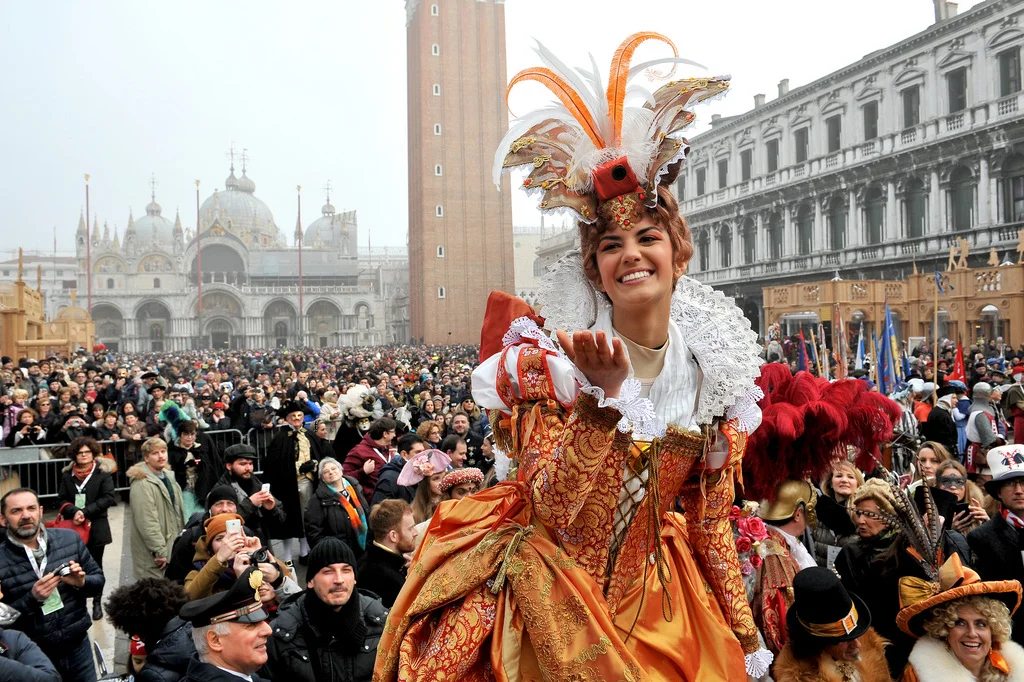 Hier fand der "Volo dell'Angelo" statt: der "Engelsflug". Er ist der Höhepunkt des Karnevals. Irene Rizzi (im Bild) war zur "Maria des Karnevals" gekrönt worden. Befestigt an ein Drahtseil schwebte sie dann vom Campanile aus über die Menge und auf den Platz hinunter, wo sie begeistert begrüsst wurde. (Foto: Keystone/AP/Luigi Costantini)